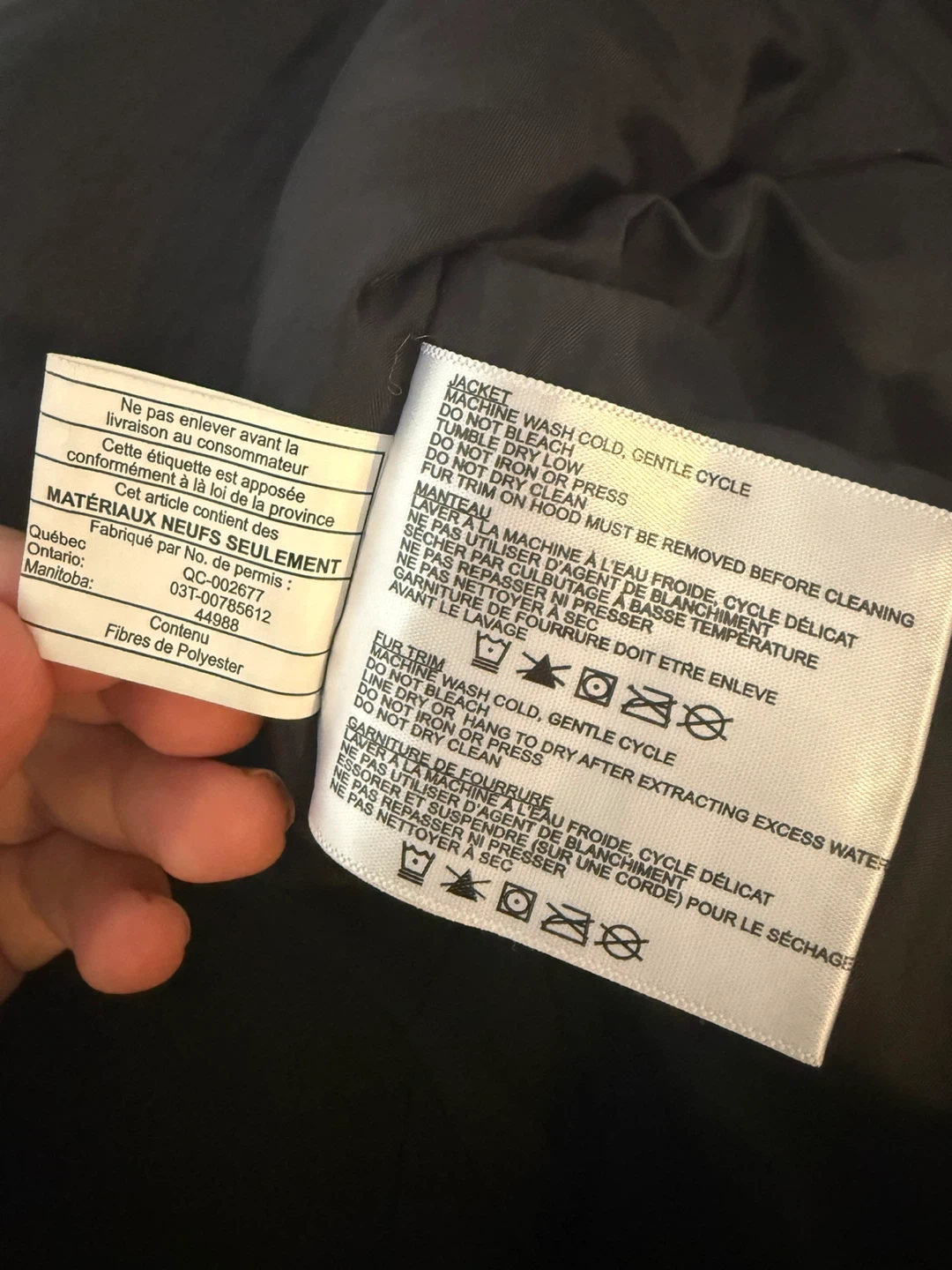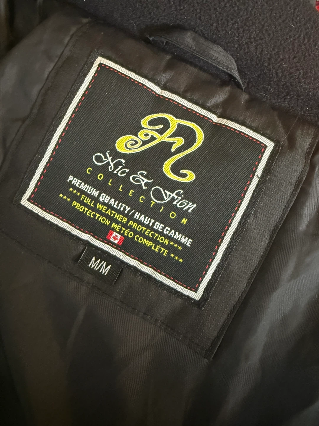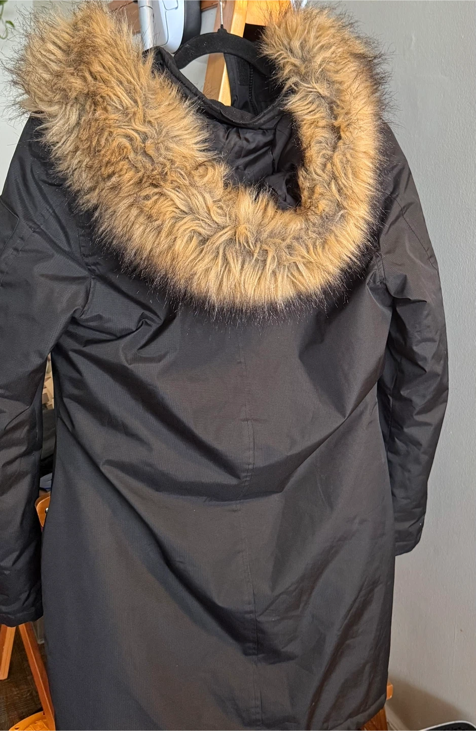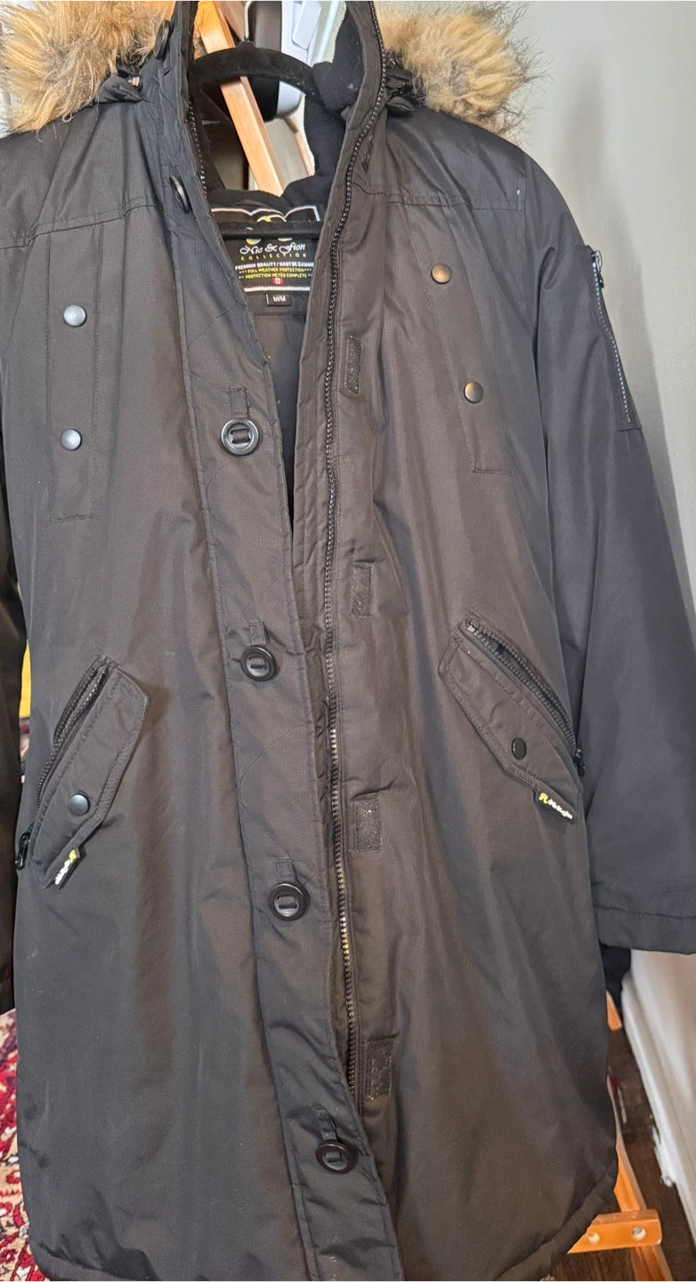Warm black winter parka with a cozy insulated interior and faux-fur trimmed hood. Features a full button and zipper closure, multiple pockets, and a longer length for extra warmth. Made from durable polyester fabric, designed for cold weather protection.