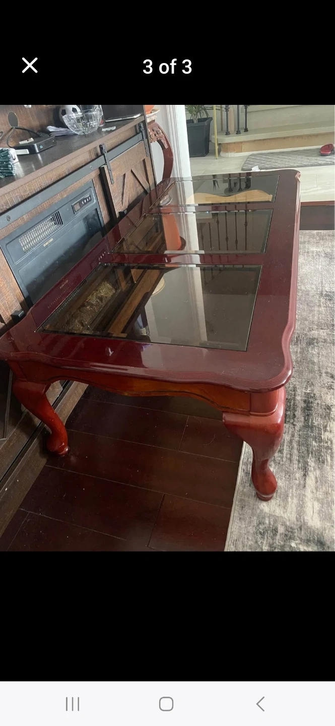 A classic dark wood coffee table featuring a multi-panel glass top. It has ornate carved legs and a rich mahogany finish. This table's dimensions are suitable for most living rooms.