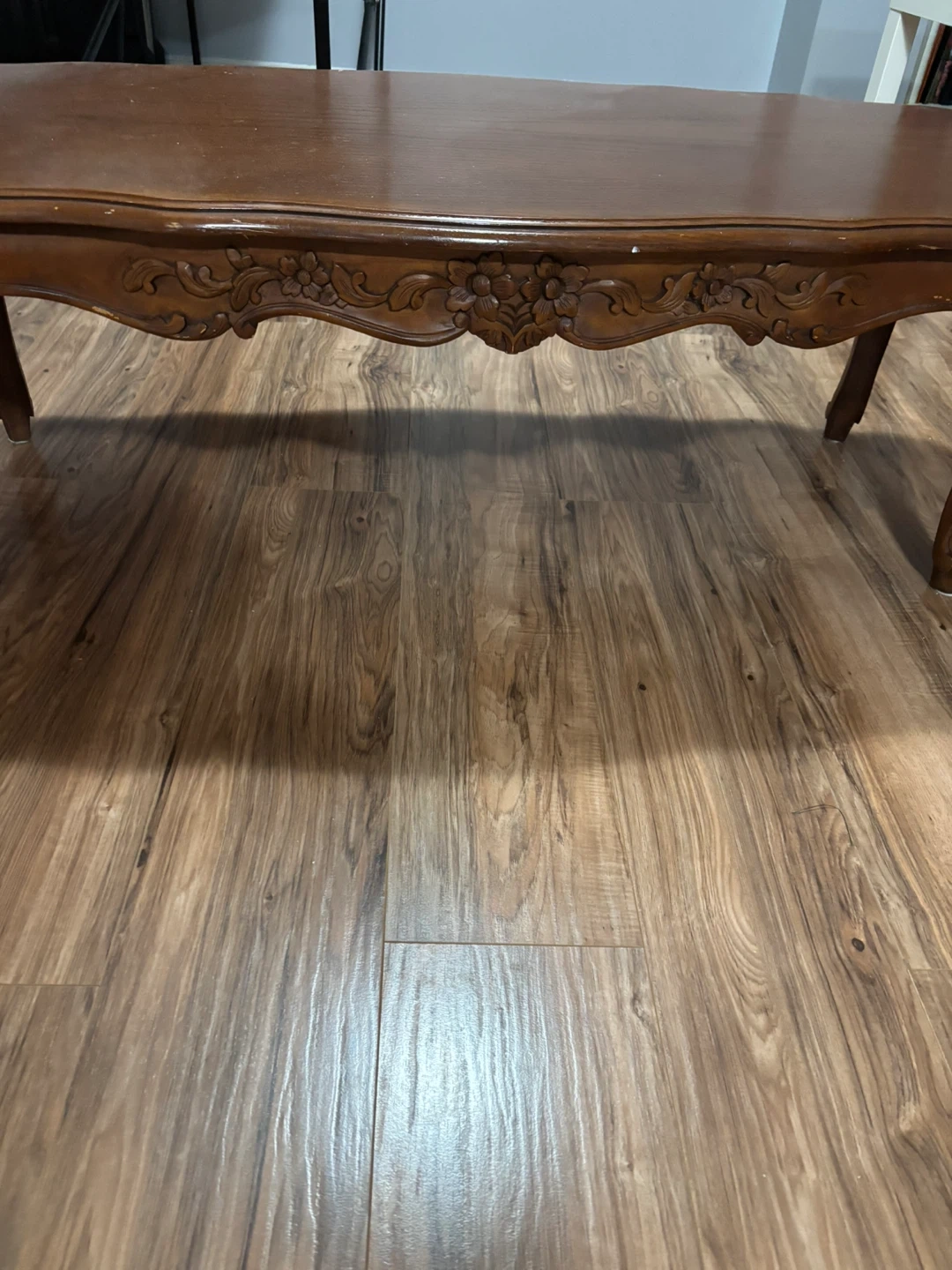 This is a classic wooden coffee table with intricate carved detailing along the apron. Its dark wood finish and unique shape add a touch of vintage charm to any living space. It's sturdy and ready for a new home! Pet free, smoke free, cash only