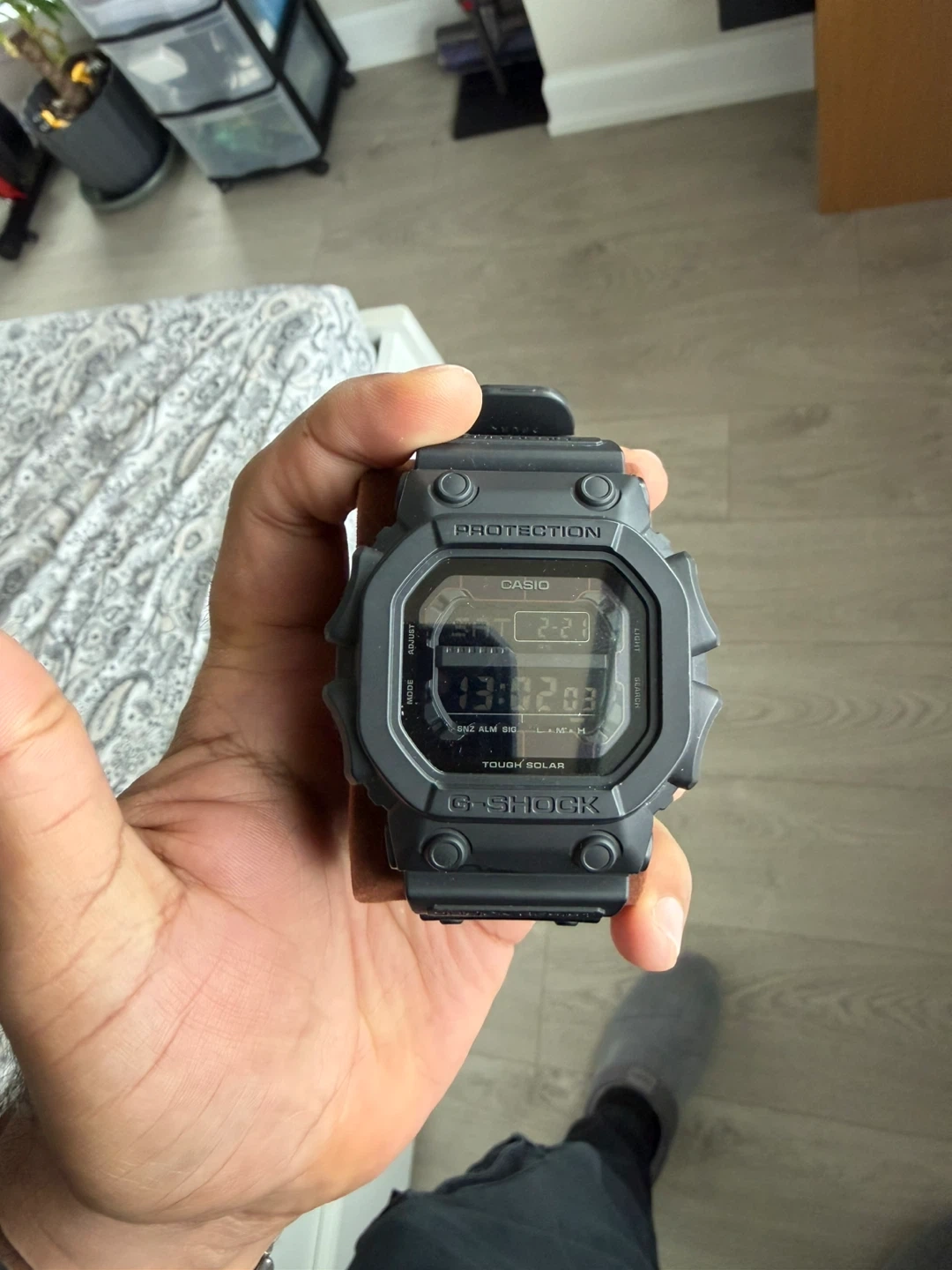Casio G-Shock watch with Tough Solar power. It features Mud Resist technology for durability. This digital watch has a black resin band and is water-resistant.