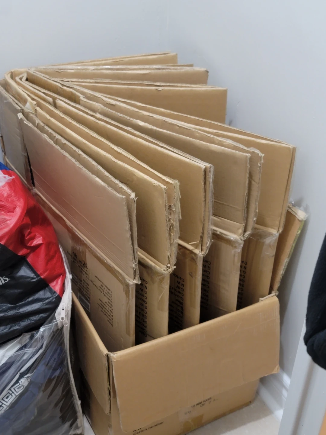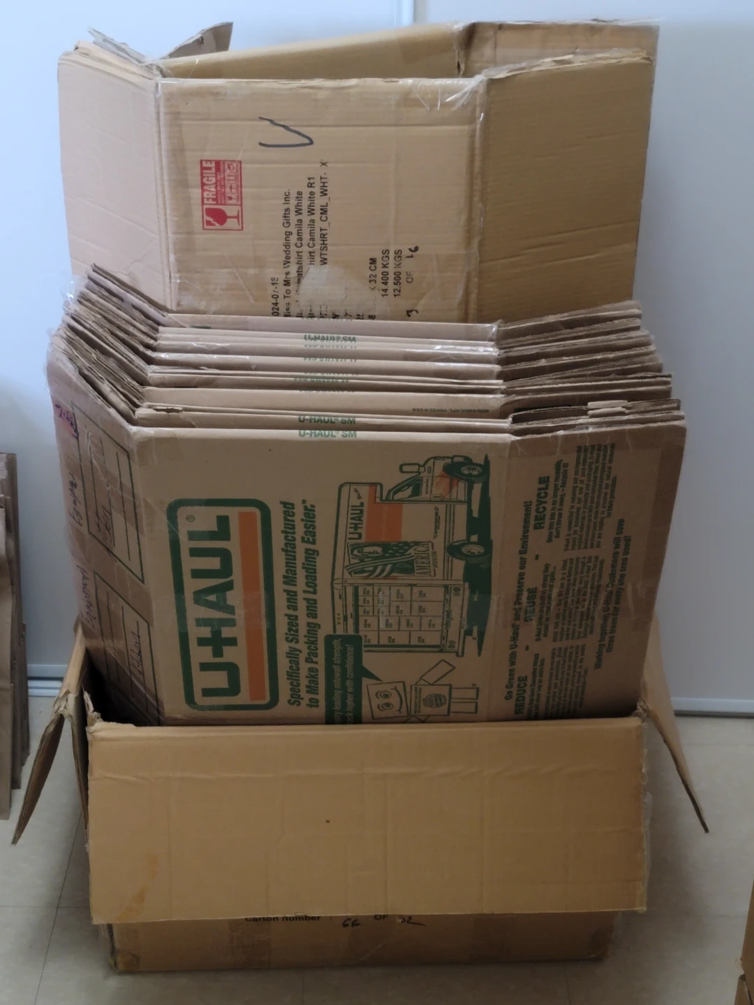 A collection of U-Haul moving boxes and larger thicker boxes, bubble wrap great for storage or packing up belongings. Also includes a stack of Walmart Delivery Pass paper bags. Ready for your next move or organizational project.