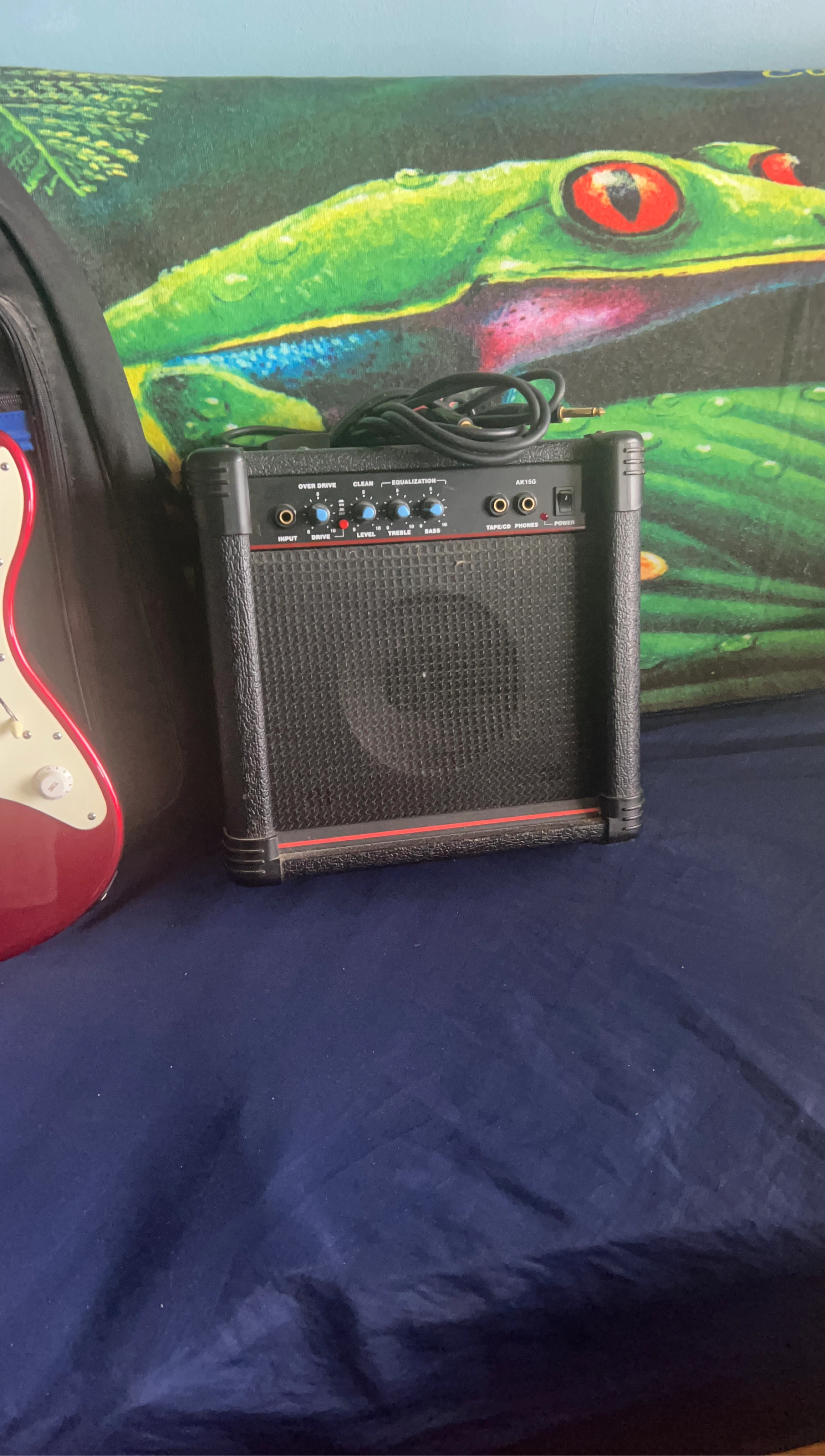 10Selling an AK15G guitar amplifier. It has overdrive, clean, and equalization settings. Includes input, drive, level, treble, and bass controls, as well as tape/CD and phones inputs