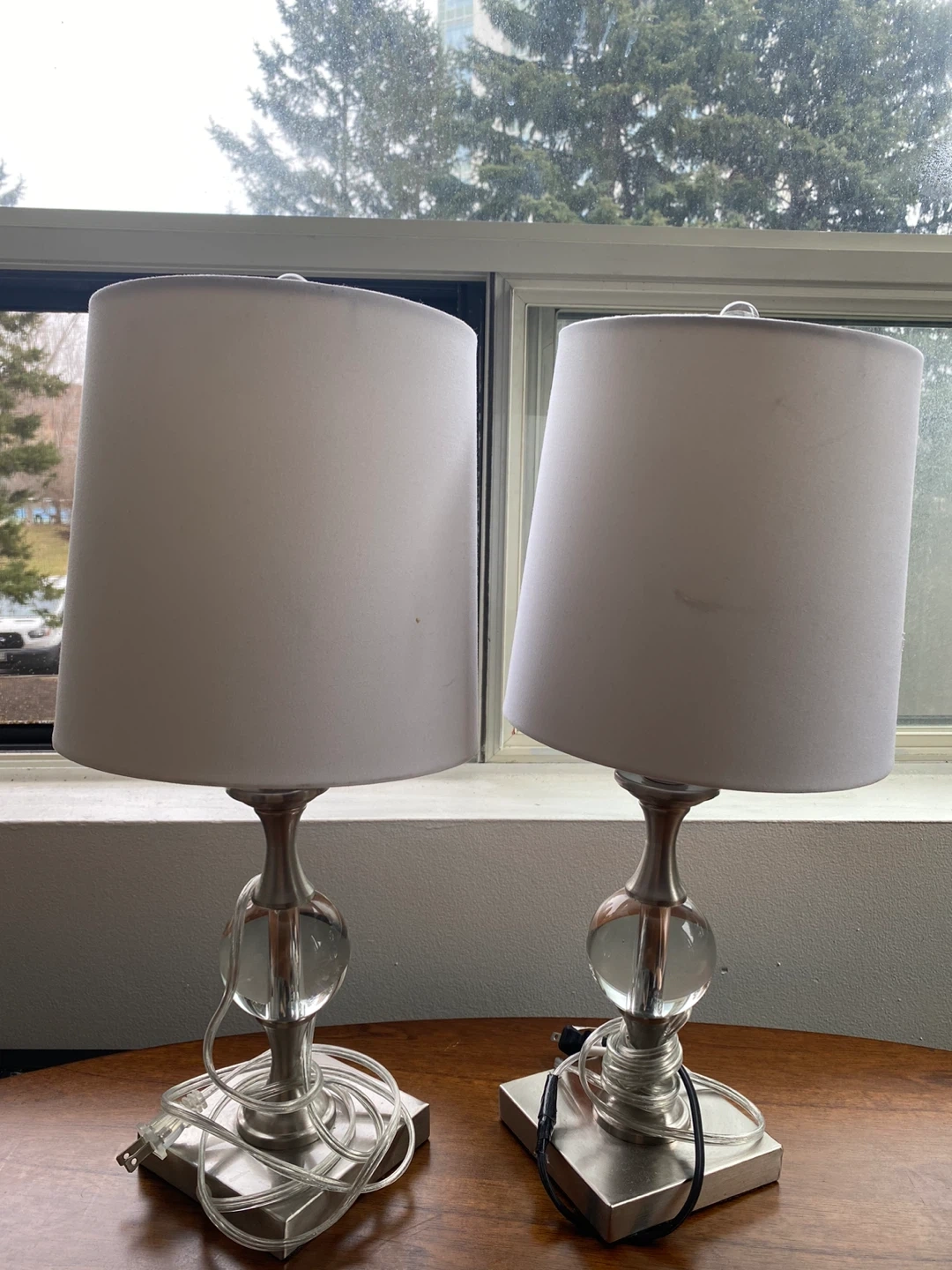 Selling a matching pair of table lamps. They feature a silver metal base with a clear glass orb accent in the middle. Each lamp has a white fabric shade. Perfect for adding a touch of elegance to a living room or bedroom!