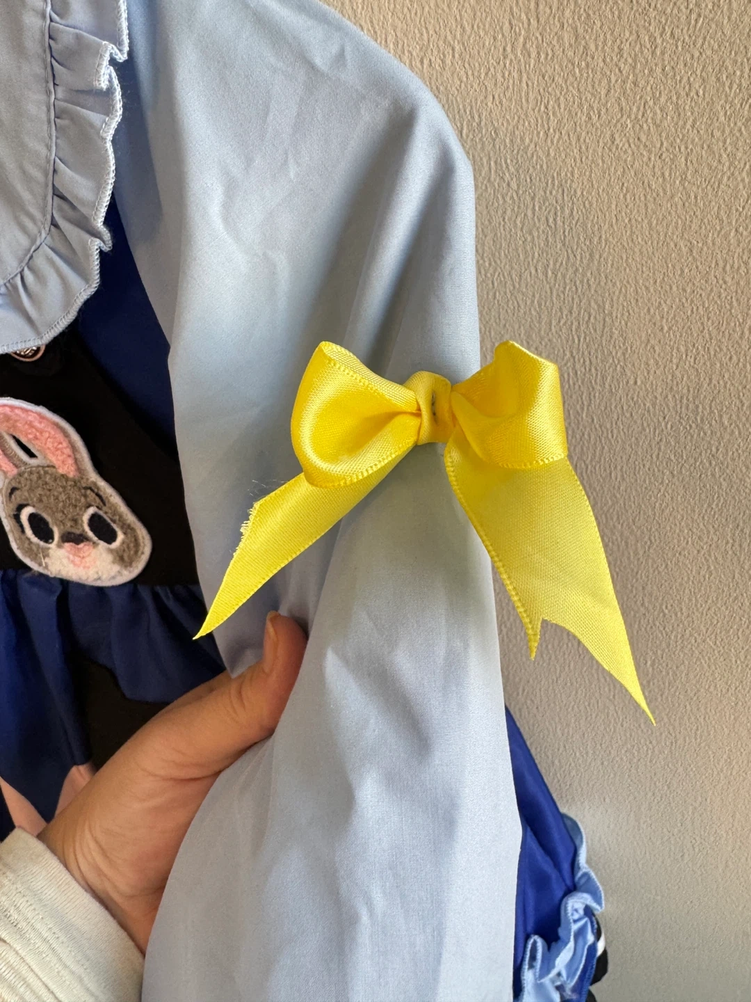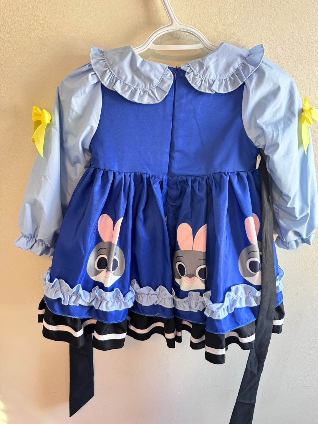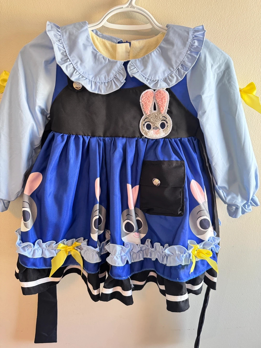 A cute blue dress featuring Judy Hopps from Zootopia. It has a Peter Pan collar, yellow bows, and a decorative black pocket , also fleece-lined. Dress it up for parties or playtime!