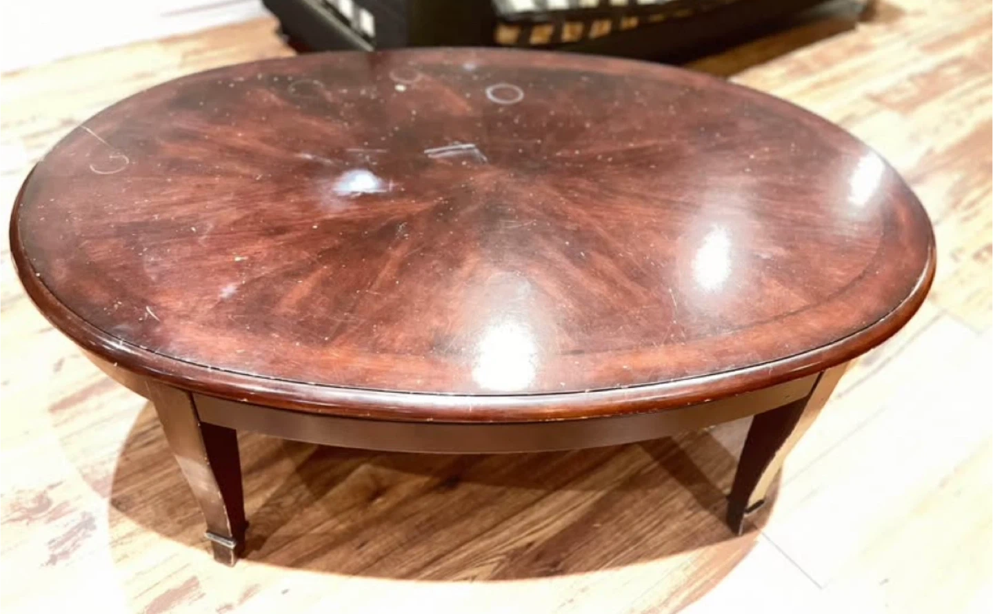Selling a dark wood coffee table. It has some signs of wear and tear, as shown in the photos, but still has plenty of life left in it! Is in solid condition 100% wood