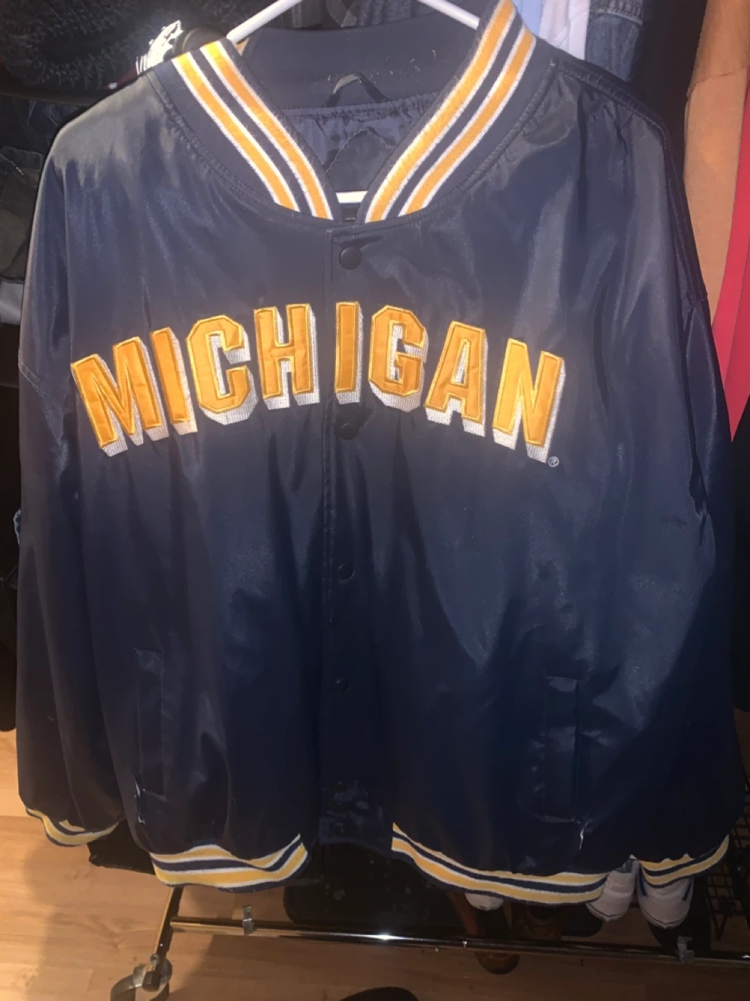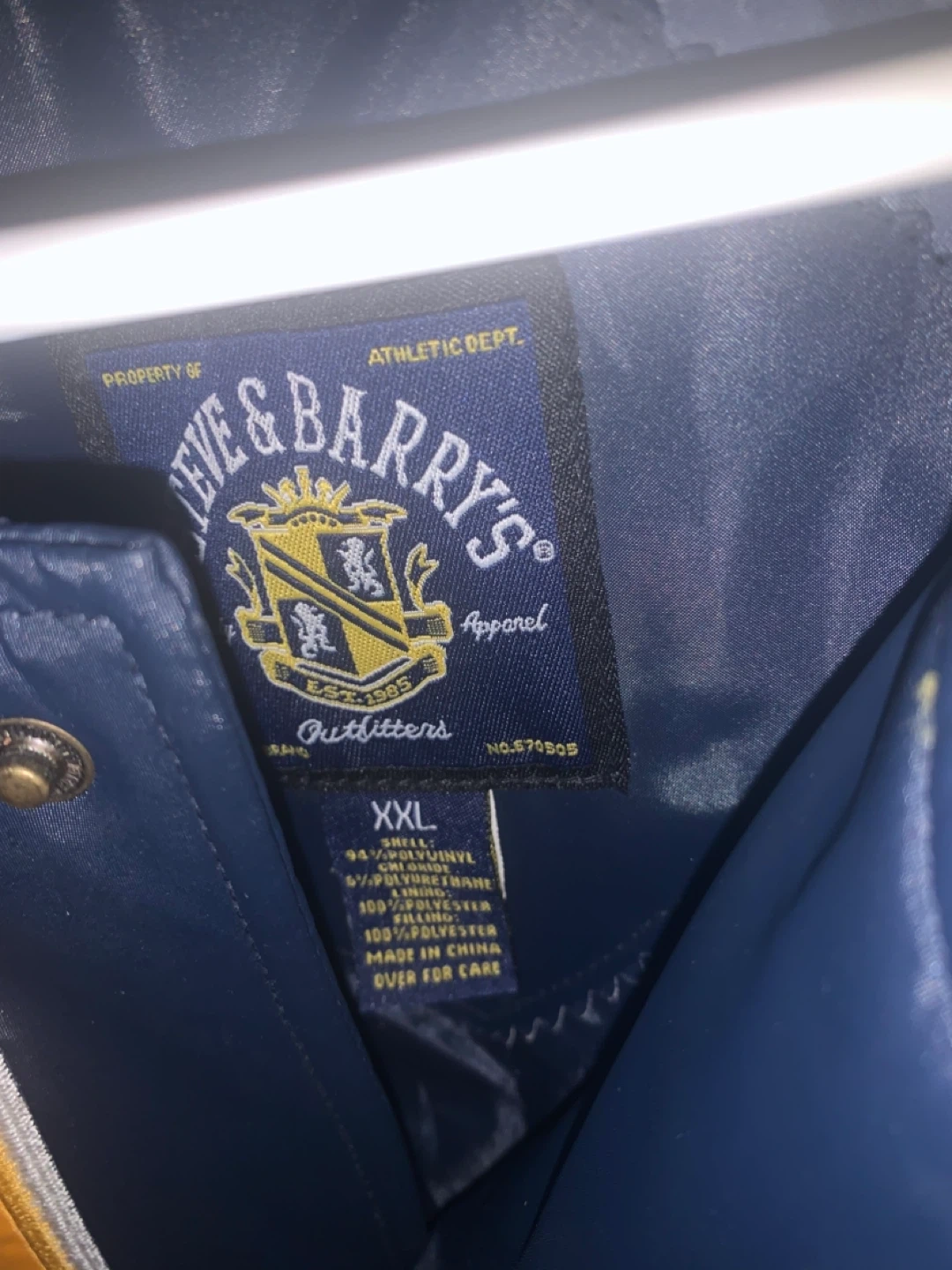This Steve & Barry's jacket celebrates the Michigan Wolverines! It's a size XXL with a snap-button front and striped collar and cuffs. Shell: 95% Polyvinyl Chloride, 5% Polyurethane. 100% Polyester.