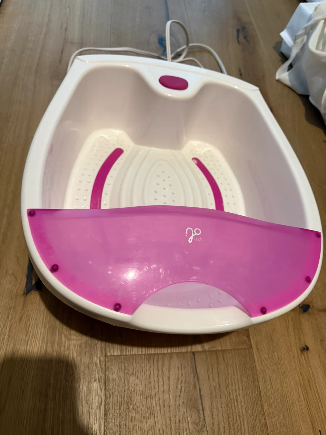 Electric foot spa bath with a pink and white design. relaxing foot soak experience. This spa is designed to soothe tired feet after a long day.