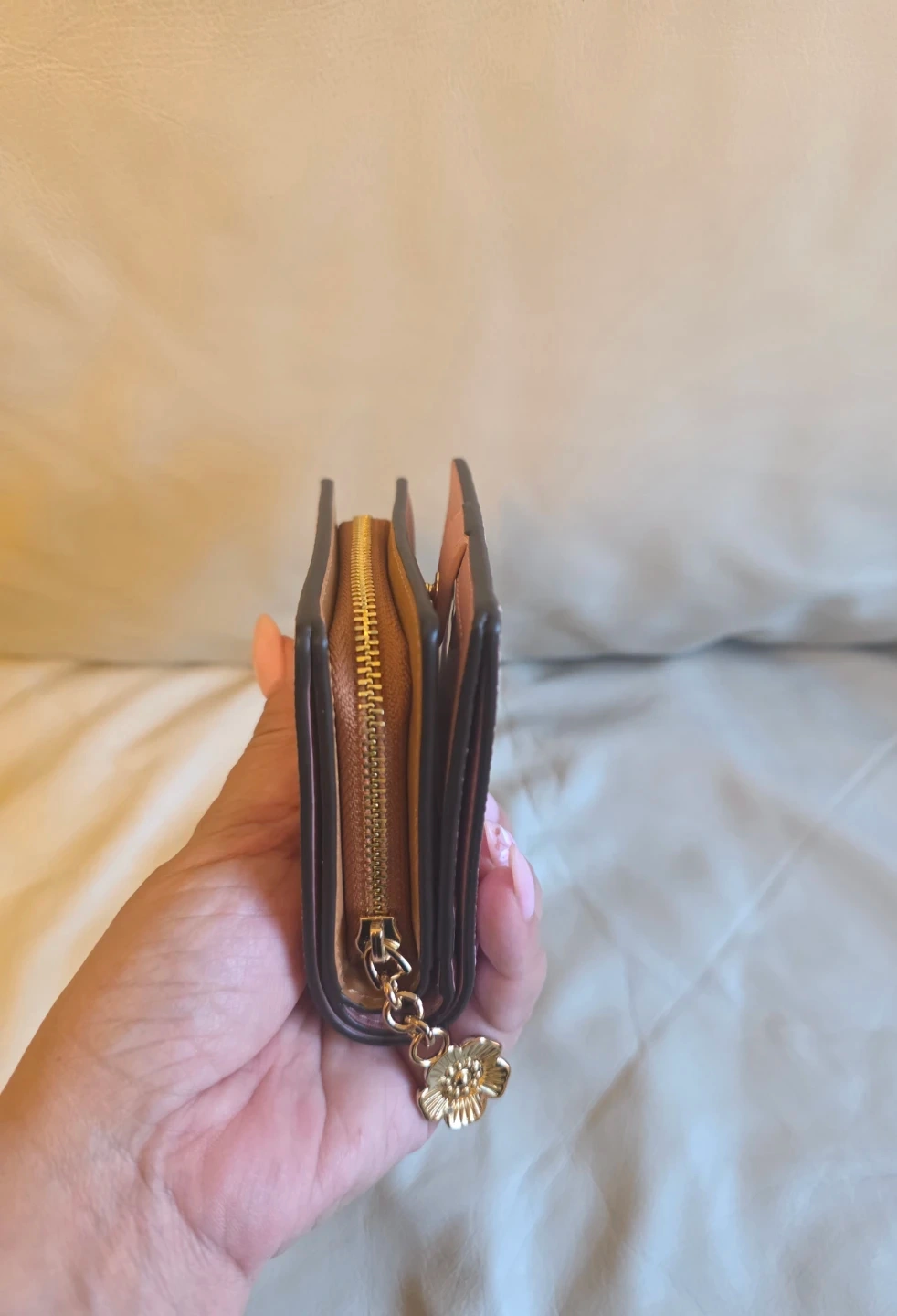 Outside zip coin pocket with 3 credit card slots. snap closure, full-length bill compartment, and ID window.