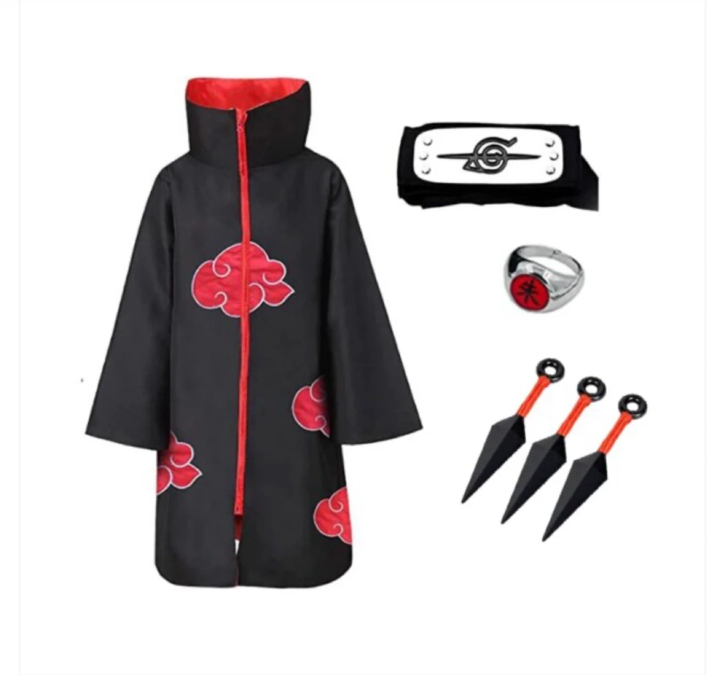 Selling a complete Akatsuki Halloween costume or cosplay set from Naruto! It includes the Akatsuki robe, headband, ring, and kunai. Everything you need to complete your cosplay or Halloween costume look is here!