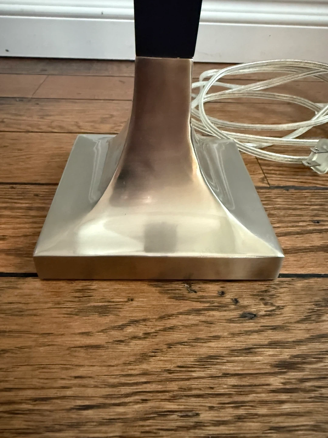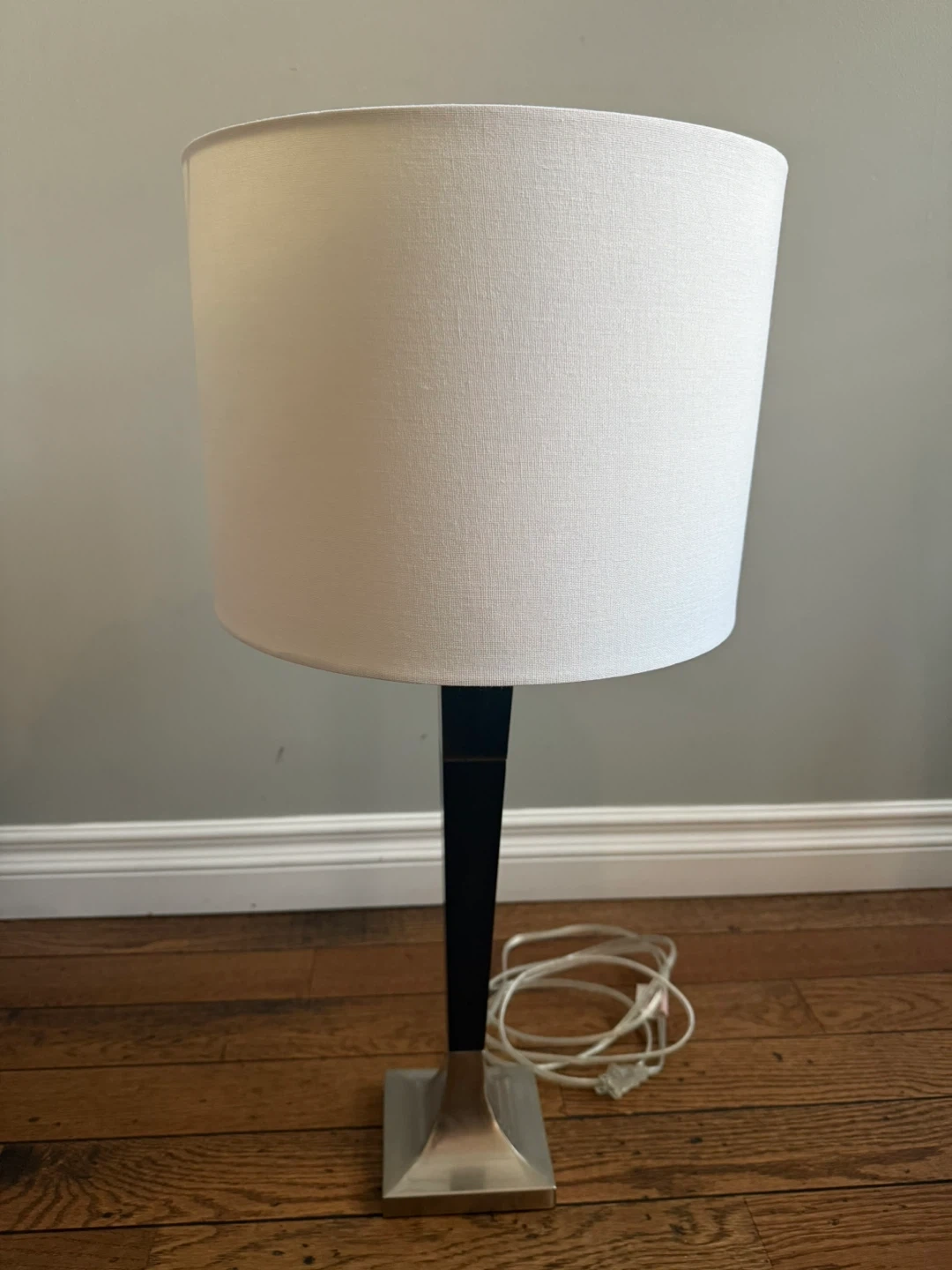 This table lamp features a sleek black stem and a brushed nickel base. It comes with a clean white linen drum shade, offering a contemporary look for any room. It's perfect for adding ambient lighting to your living space or bedroom.