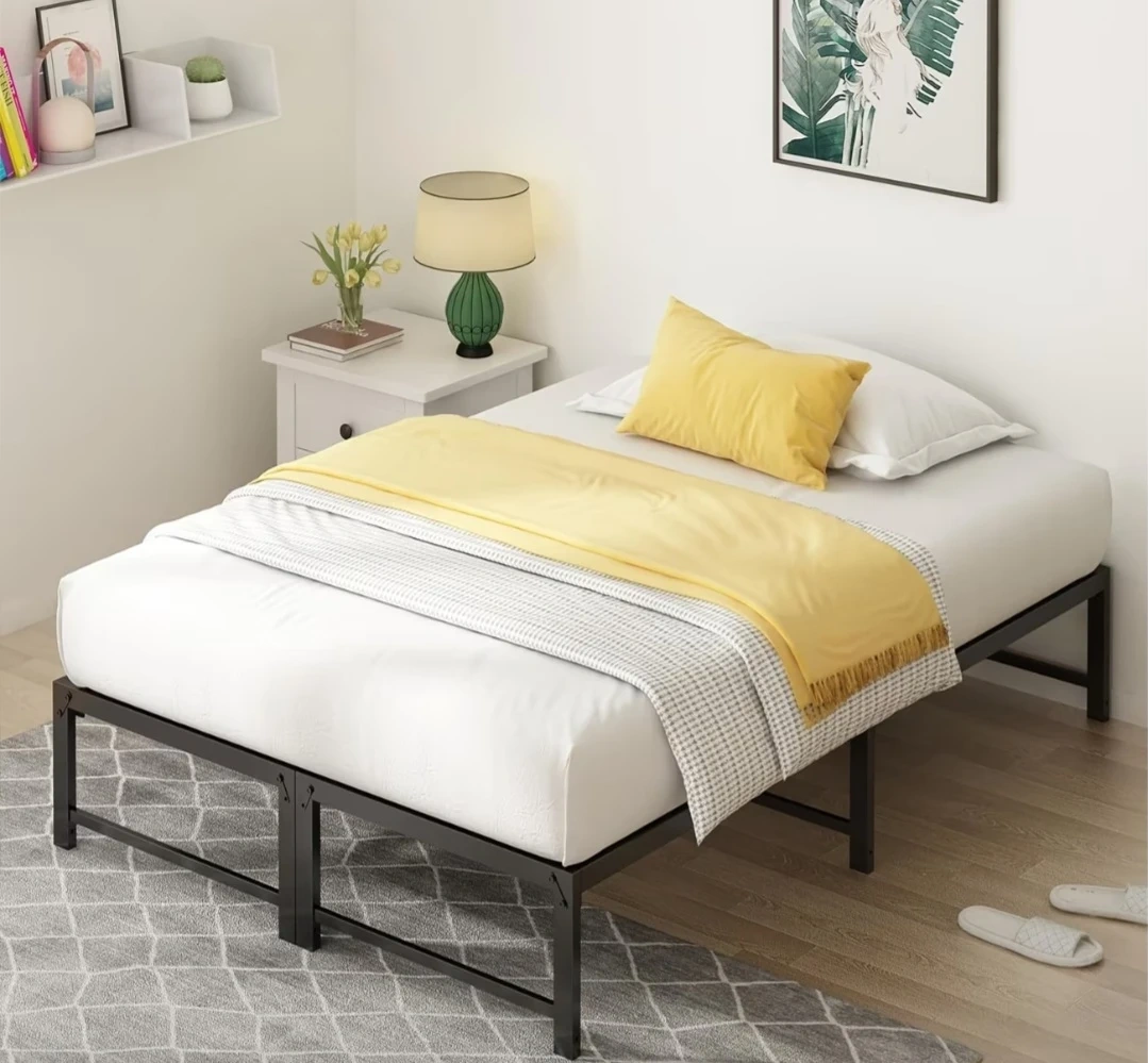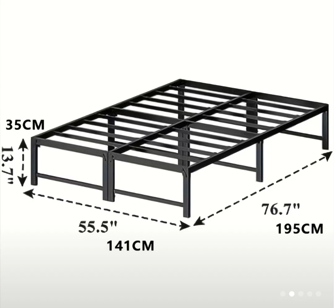 Selling a metal platform bed frame, perfect for a twin-sized mattress! The dimensions are approximately 76.7" x 55.5" and 13.7" high. It is easy to assemble and has a heavy load bearing capacity of 800lbs. This bed frame is also noise-free!