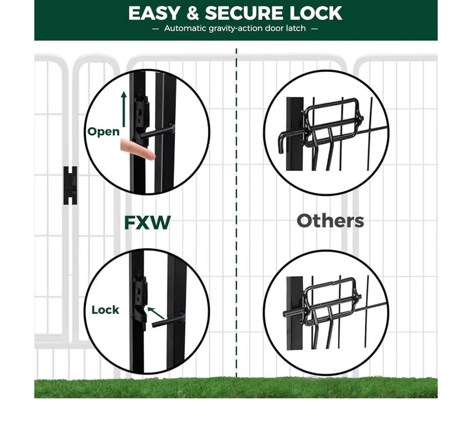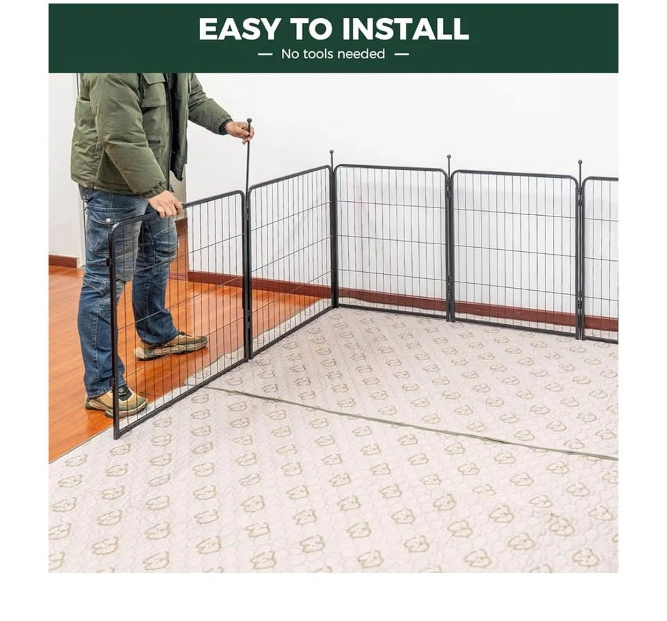 This FXW dog playpen offers a spacious and safe area for your small to medium-sized dog, both indoors and outdoors. It's made of durable black metal and sets up in under 5 minutes. The panels are connectable and can be arranged in various shapes. The stakes have rounded tops to protect your dog's paws, and the door features a secure locking mechanism. Great for use in the yard, for RV camping, or traveling. When using indoors, consider placing it on a rug or mat to protect your floors.