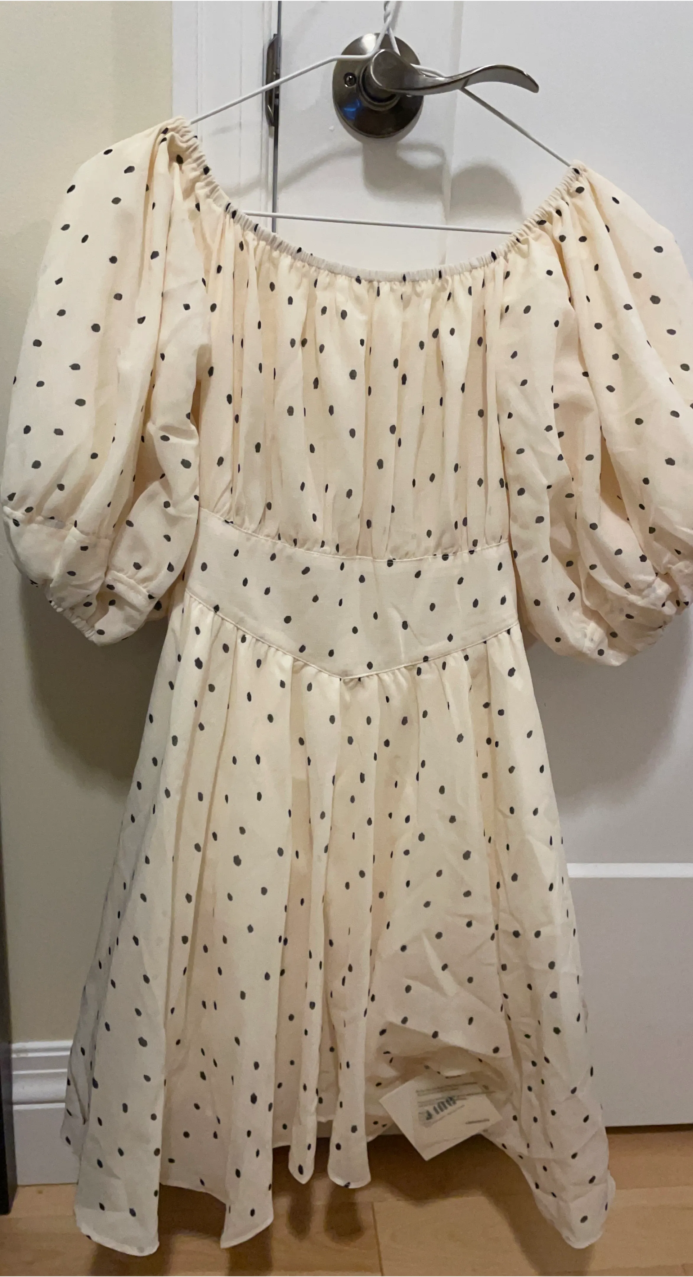 Cream dress with black polka dots. It features an off-the-shoulder neckline and puff sleeves. Dress length is mid-calf.