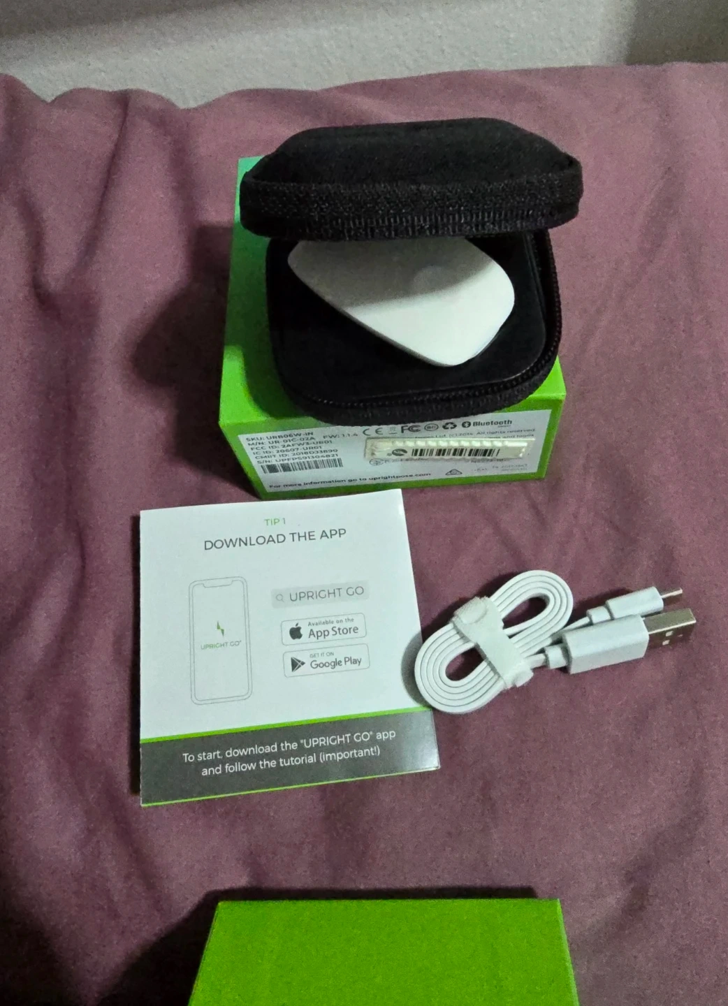 This is the Upright GO S Lite posture trainer. It's a device designed to help improve your posture. Includes the device, charging cable, and carrying case.