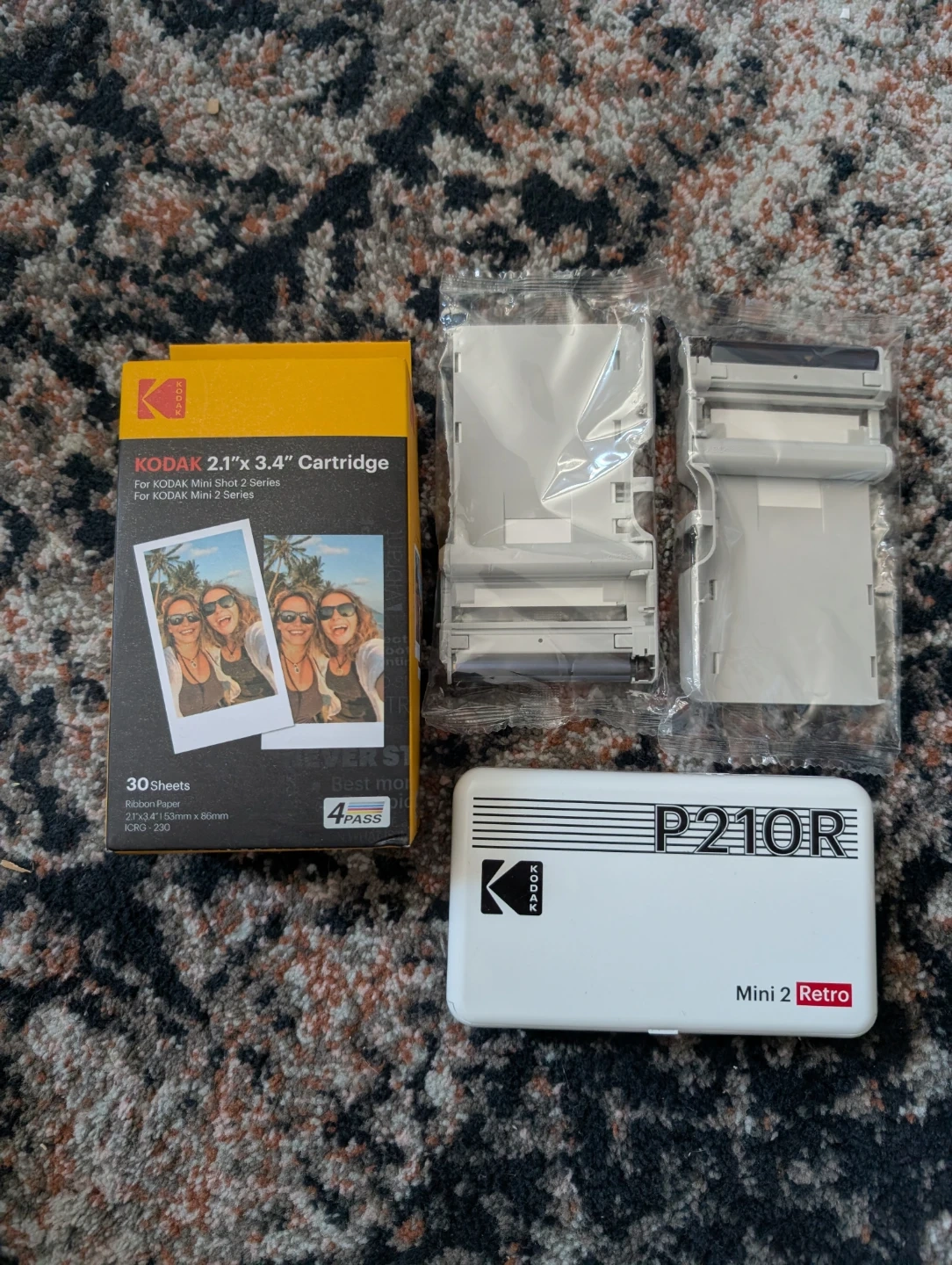 GREAT DEAL!! Originally purchased for $140. This Kodak Mini 2 Retro photo printer comes with a 30-sheet cartridge for 2.1" x 3.4" prints and two extra packs (I believe 50 photo sheets total). Great condition just doesn't connect to my new phone. Charged with micro USB cord.