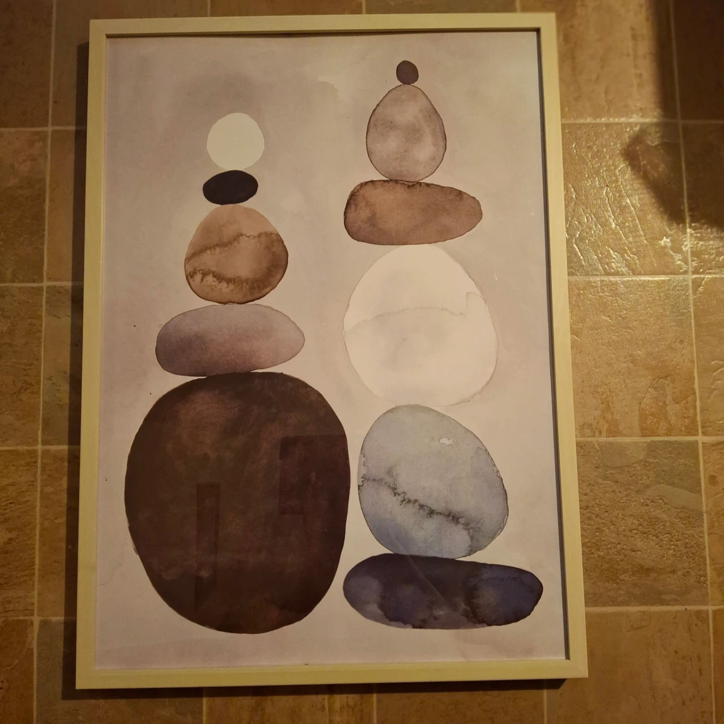 This framed art print features a soothing abstract design with stacked watercolour stones in earthy tones. It's a lovely piece to add a touch of calm to any room. The art is framed in a light wood-look border.
