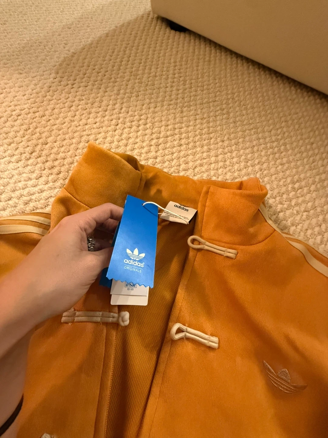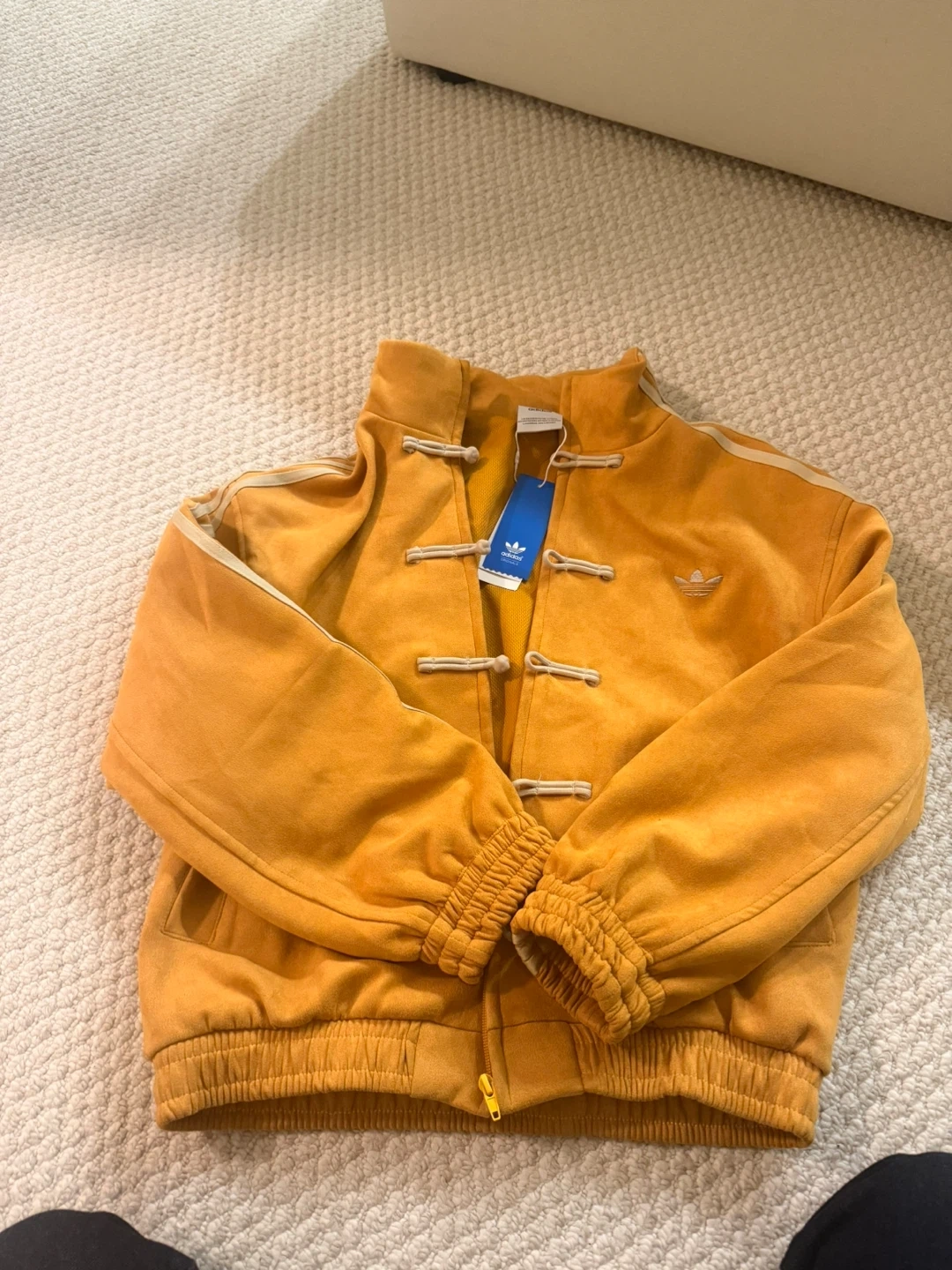 Adidas Originals yellow jacket with classic three stripes on the sleeves. It features a stand-up collar and frog button closures. Size is small.