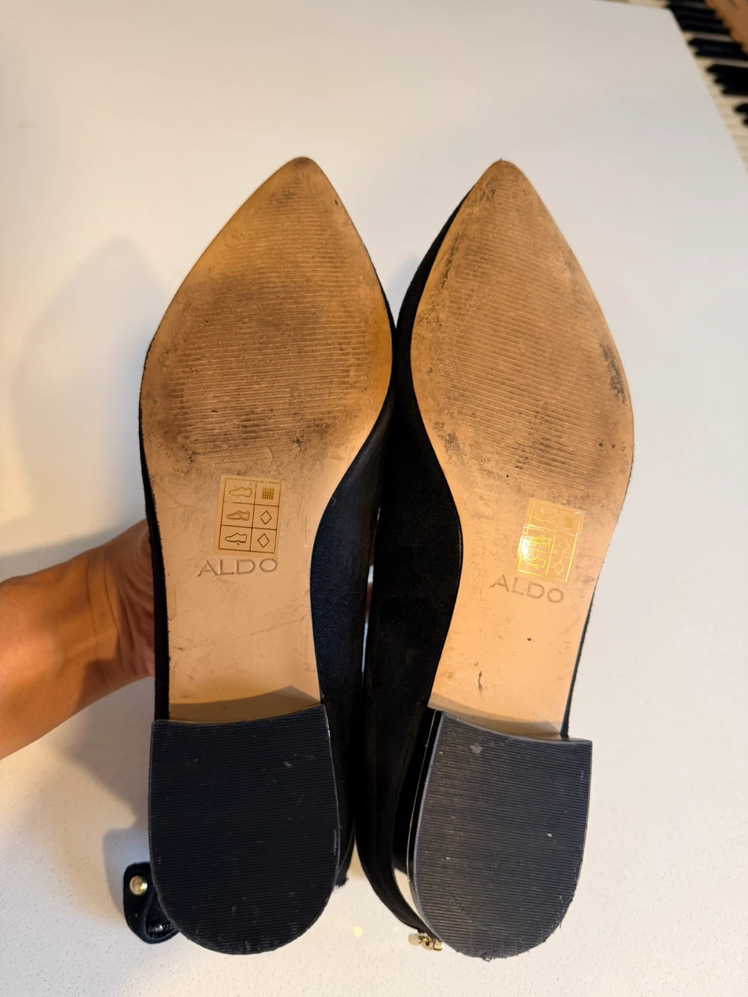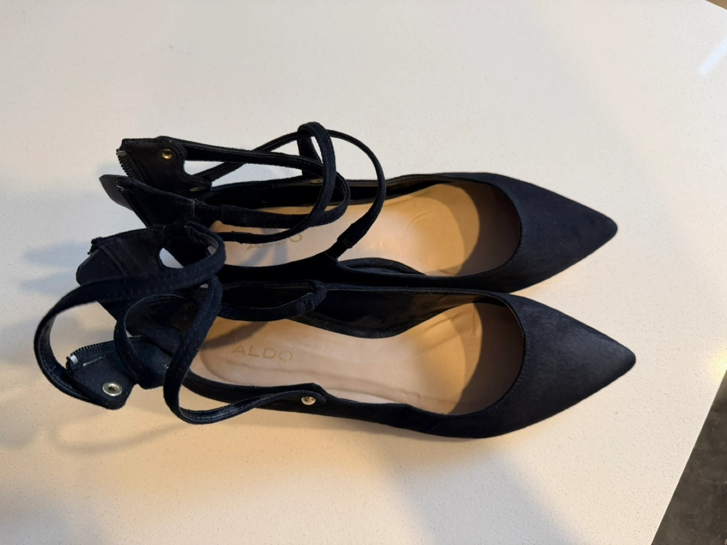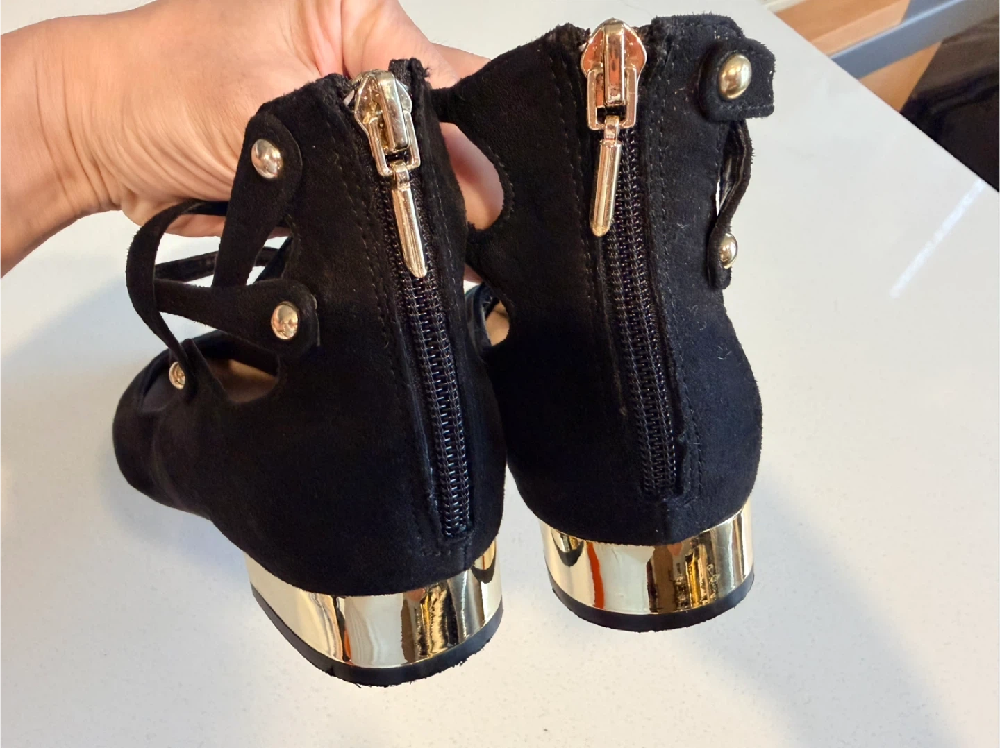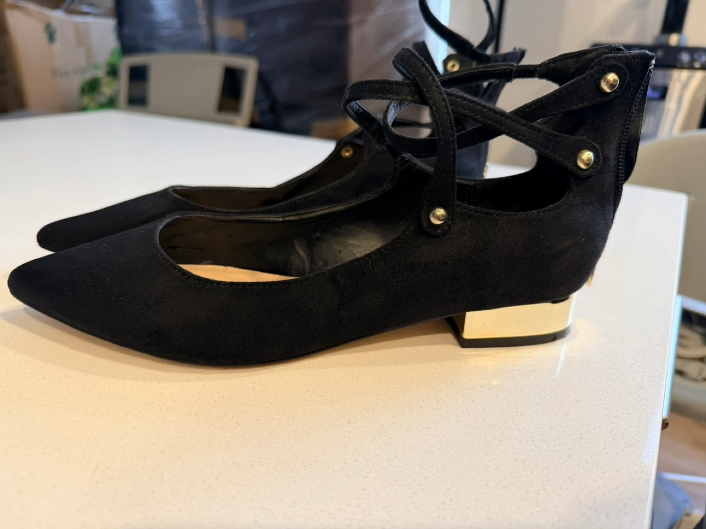 15They feature a stylish design with gold accents on the heel and a unique strap detail. These flats are perfect for adding a touch of elegance to any outfit!