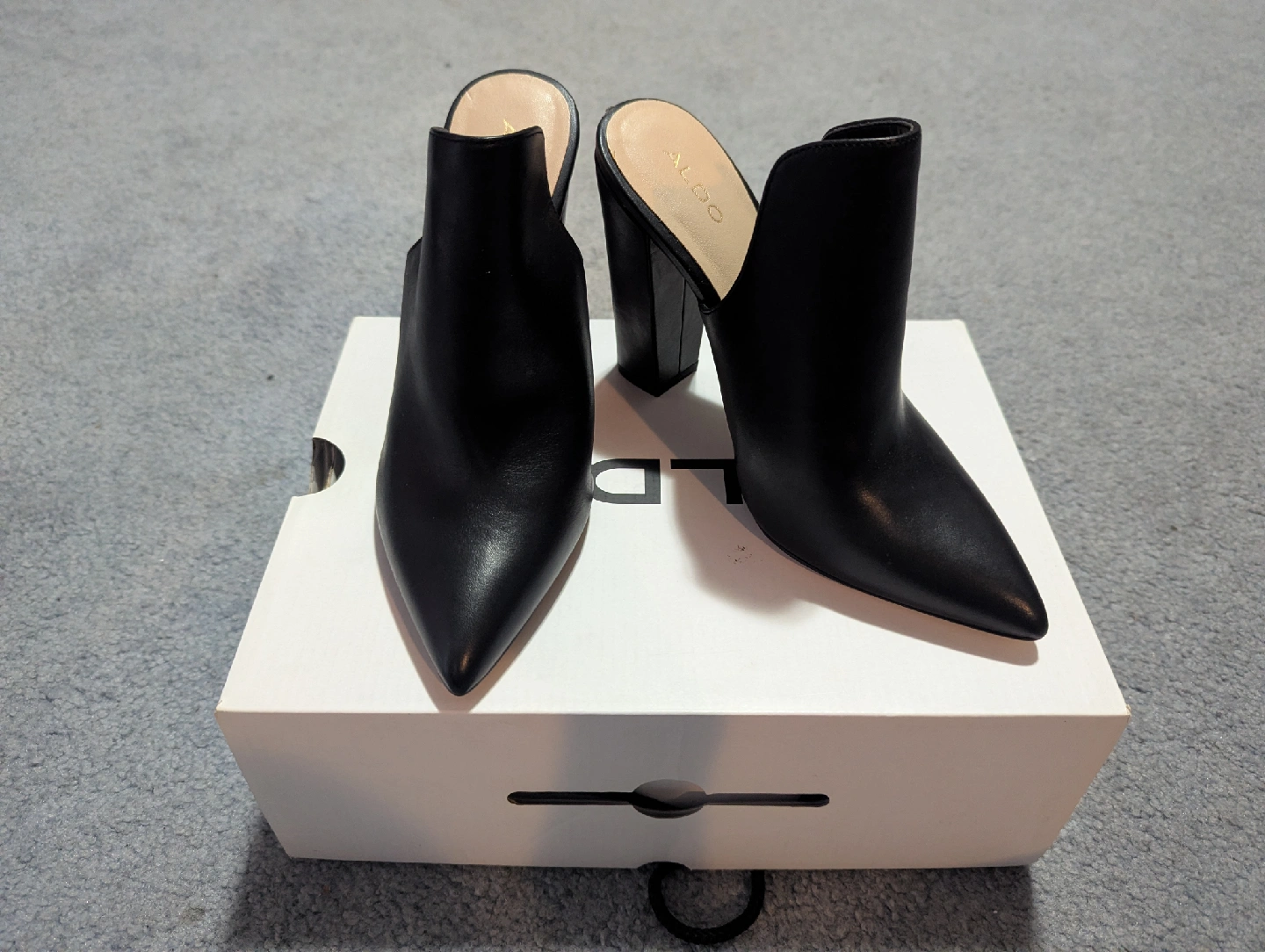 10These black ALDO slip on heels are in great condition and come with the original box. Size 8.5. Perfect for dressing up or down, these are a stylish addition to any wardrobe.