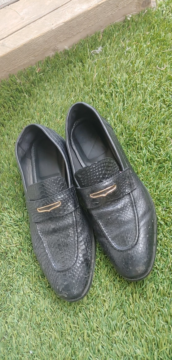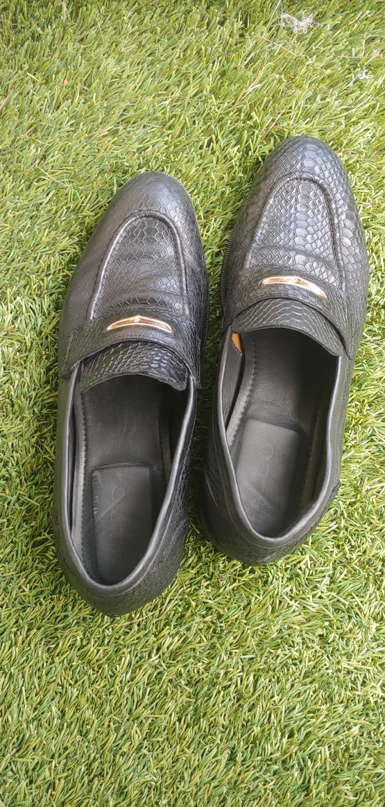 Selling a pair of Aldo loafers in black. They have a textured leather look and a gold-tone accent. These are in good condition and ready for a new home!