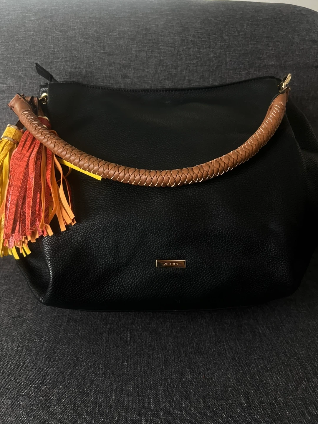 15Selling a stylish Aldo shoulder bag in black. It's in great condition and perfect for everyday use! The bag features a braided handle and colourful tassel. The interior has the Aldo logo printed throughout and includes multiple pockets for organization. New Dm for any questions.