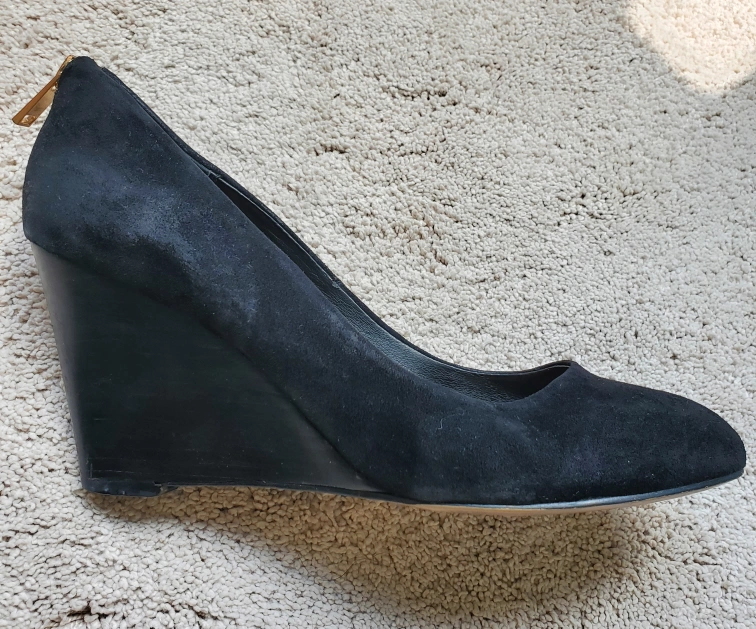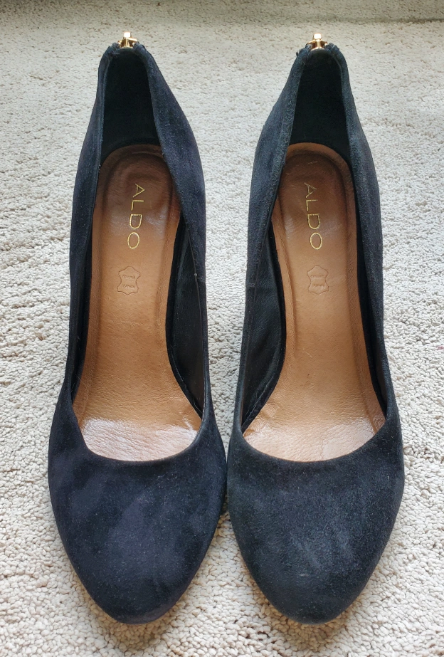 82A pair of Aldo wedge heels in black suede, in great condition. They are comfortable and versatile and have a gold zipper detail at the back. Size 9. Pickup from South Etobicoke.