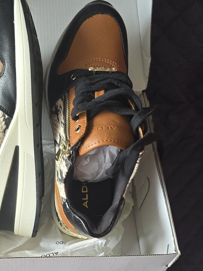 184These Aldo sneakers are new condition and come with the original box. They feature a unique snakeskin pattern on the side and a stylish mix of brown and black colours. Perfect for adding a touch of flair to your everyday look!