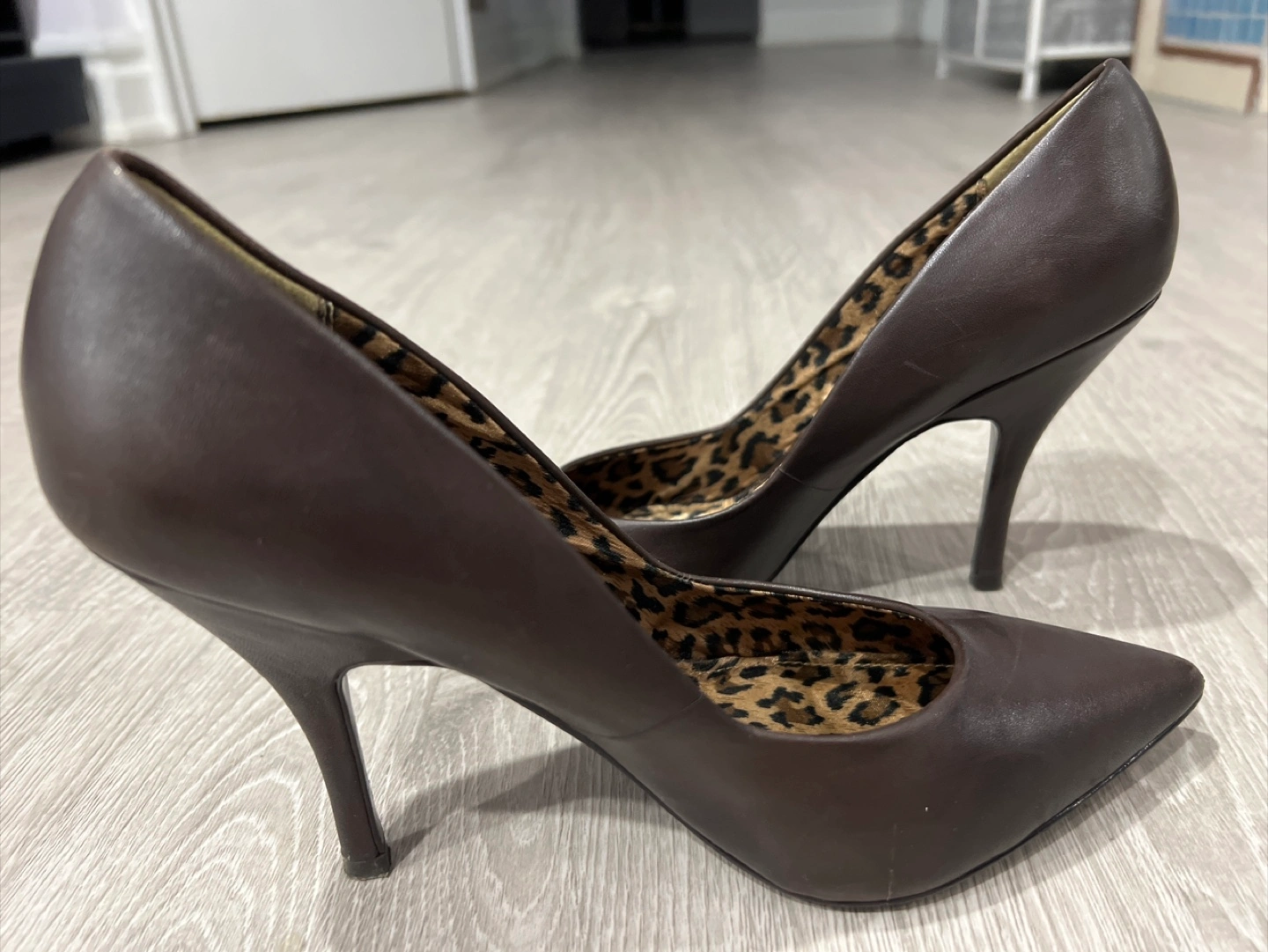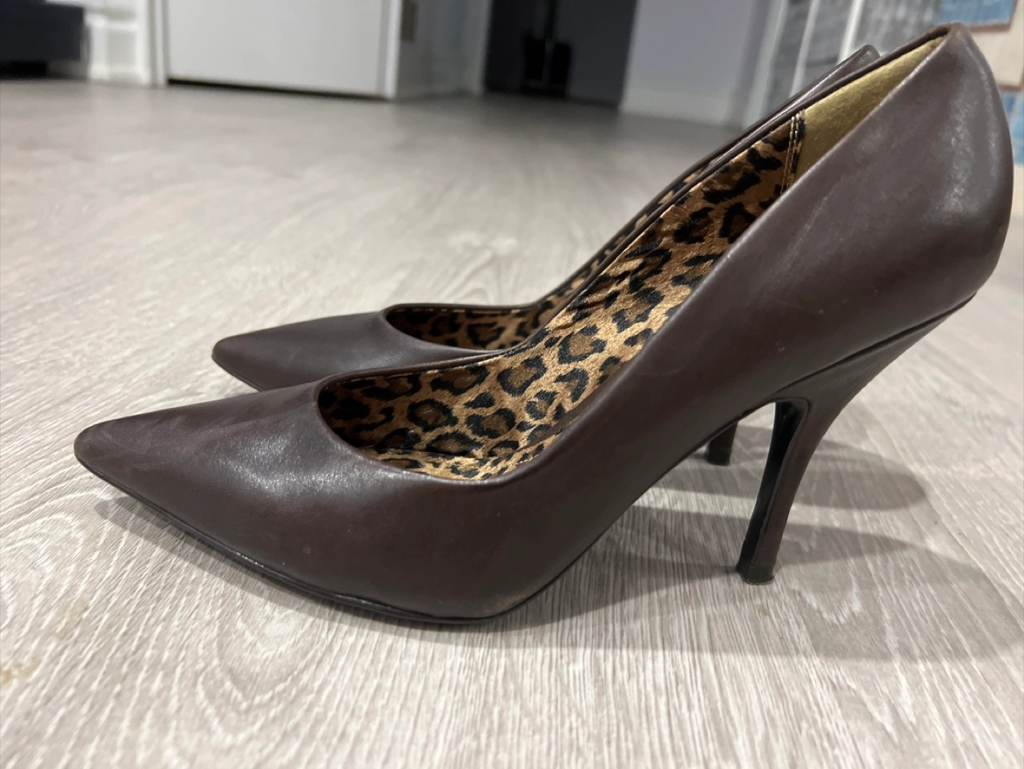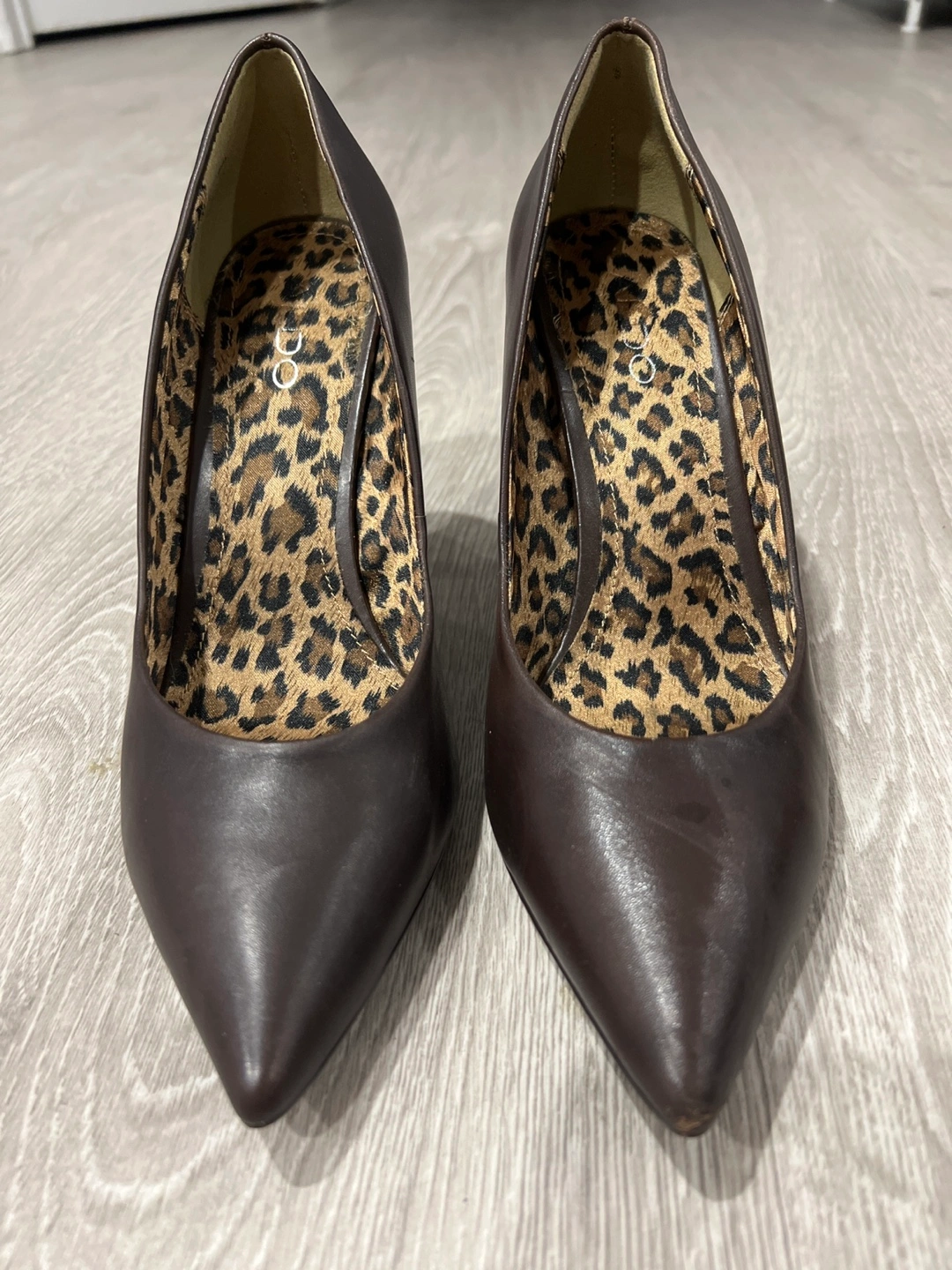 Selling a pair of Aldo heels in a lovely brown colour. They are a size 8.5 and feature a fun leopard print lining. These heels are perfect for dressing up any outfit!