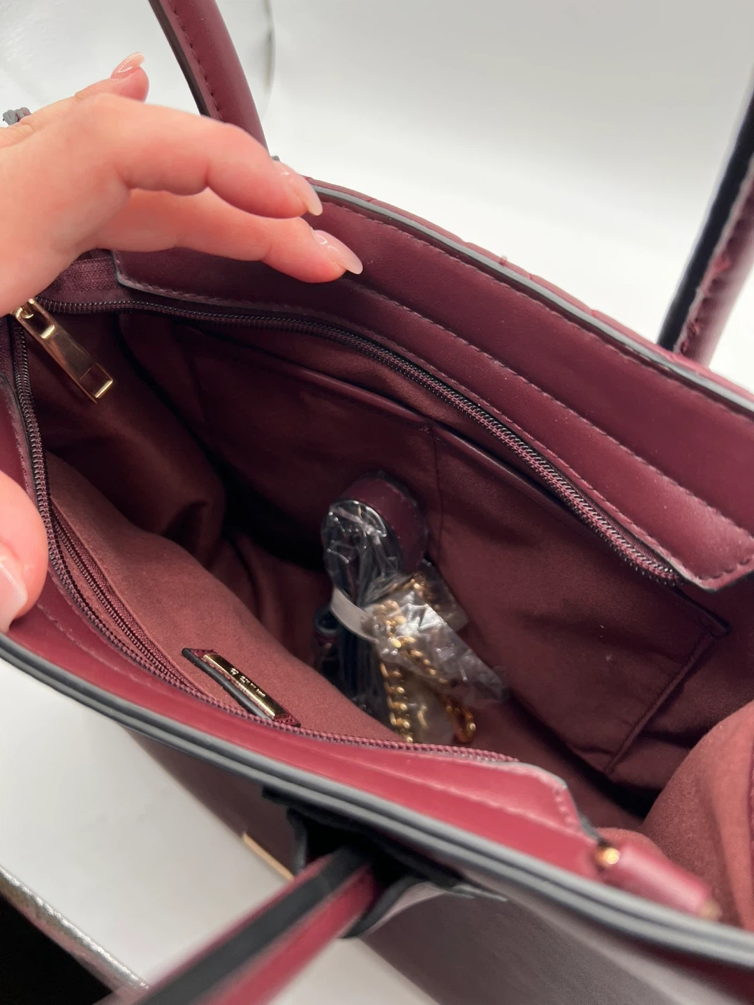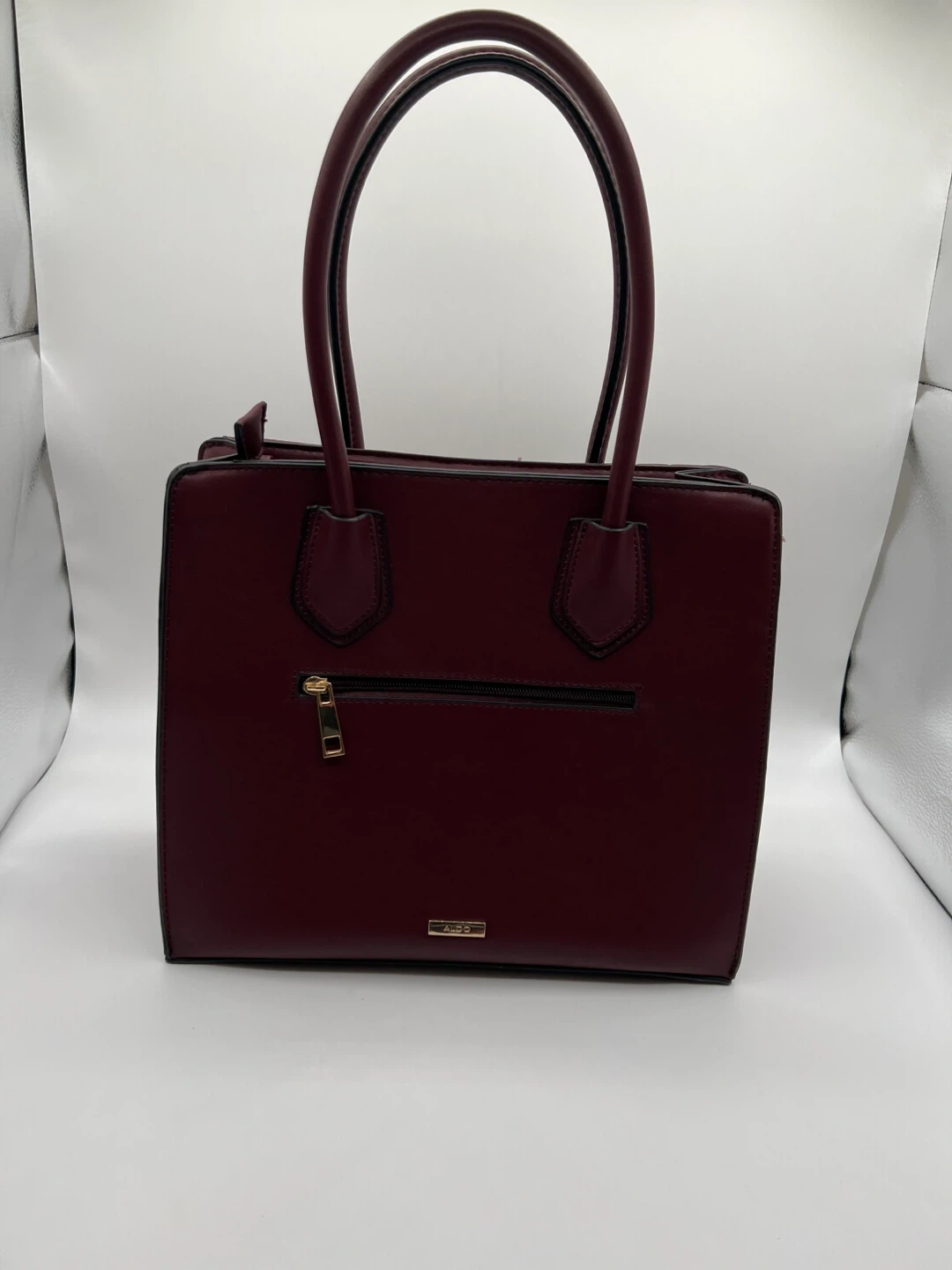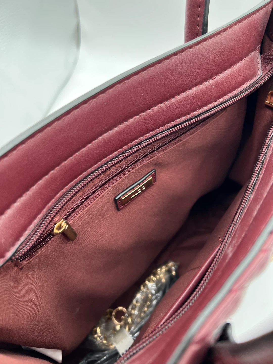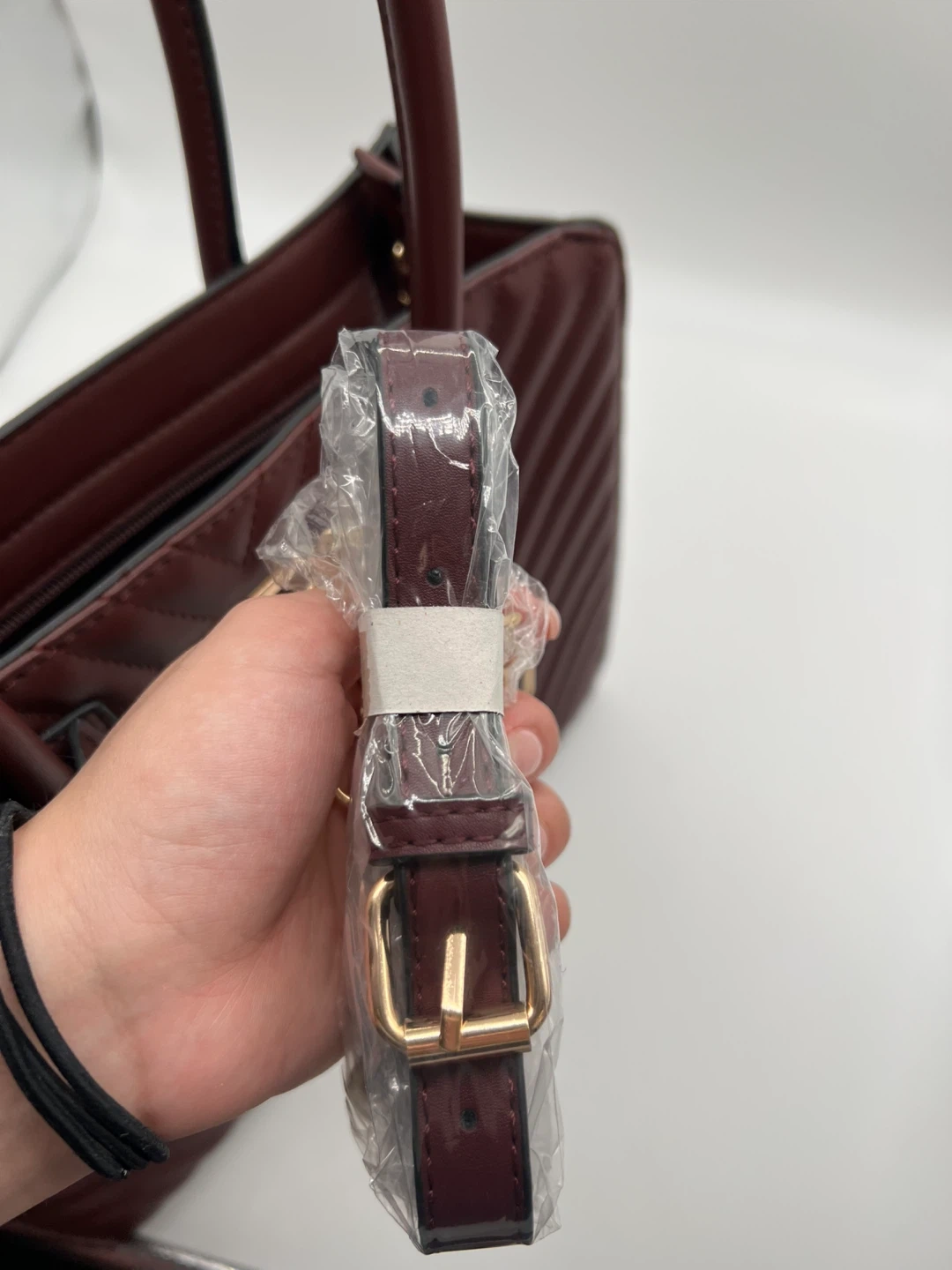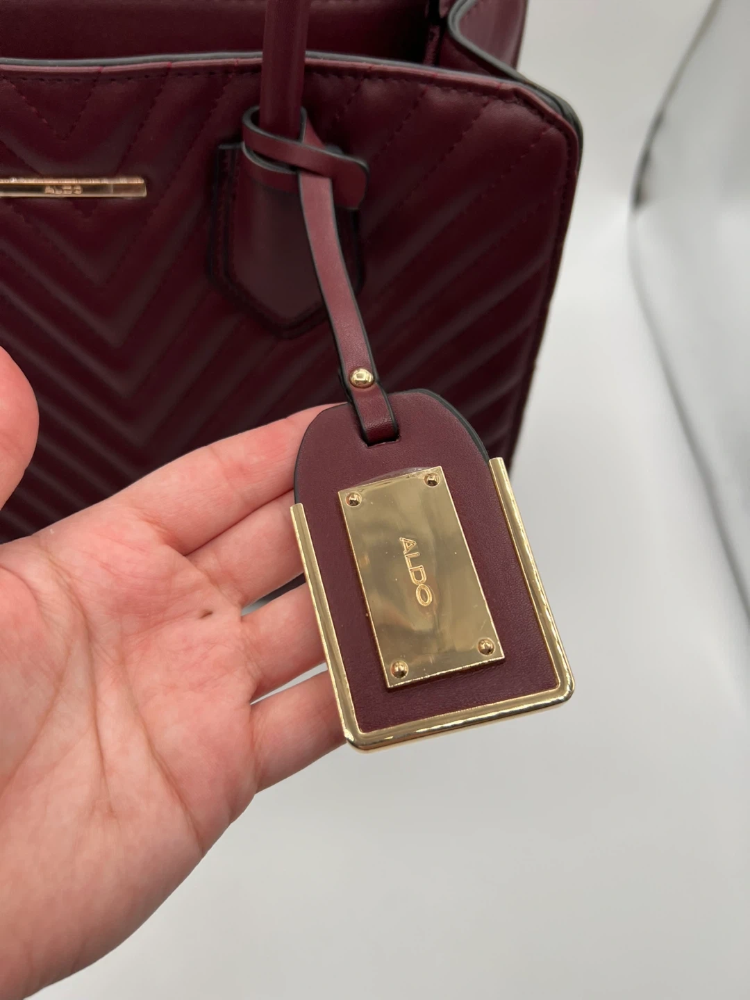 A stylish burgundy tote bag from ALDO. This bag features a quilted chevron pattern and gold-tone hardware. Perfect for carrying your essentials in style! Never worn and perfect for fall!