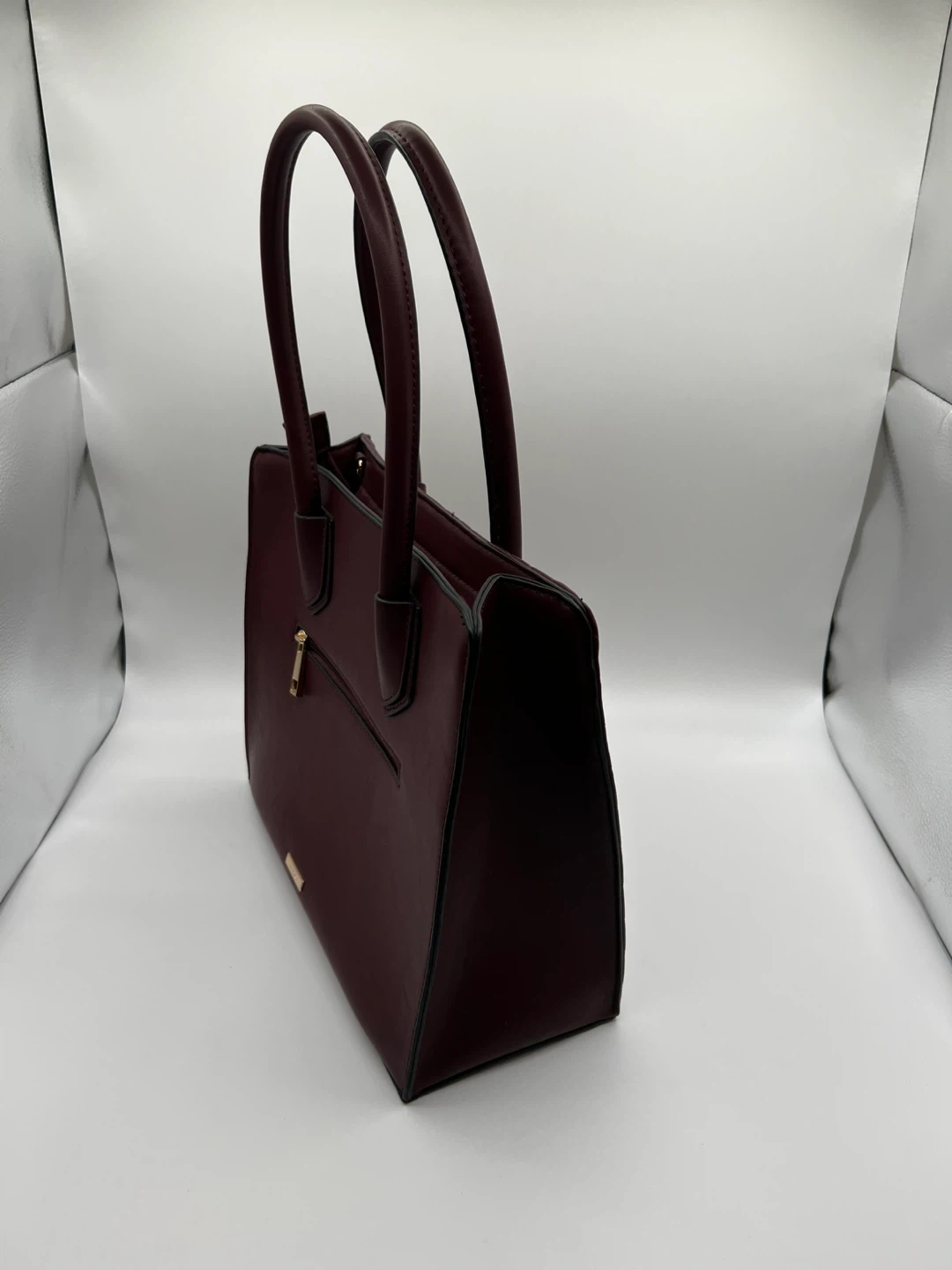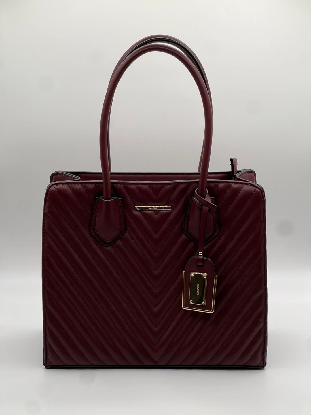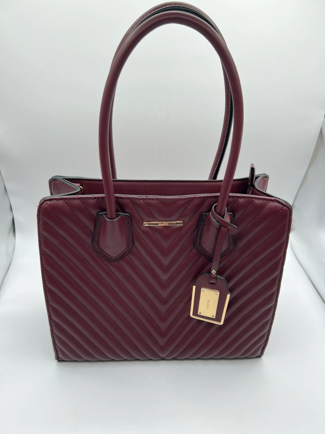 A stylish burgundy tote bag from ALDO. This bag features a quilted chevron pattern and gold-tone hardware. Perfect for carrying your essentials in style! Never worn and perfect for fall!