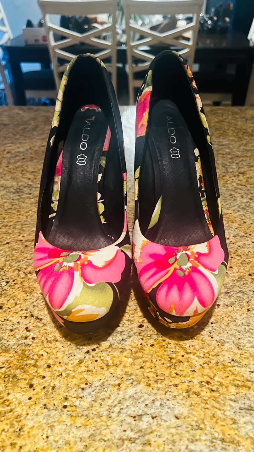 5These Aldo wedge heel shoes feature a lovely floral pattern! They're in great shape and ready for a new home. The heel height is approximately 4 inches.