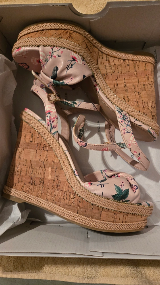 These Aldo Florenna wedge sandals are super cute with a floral pattern! They're a women's size 6.5. The wedges have a cork-like appearance. They come in the original box too!