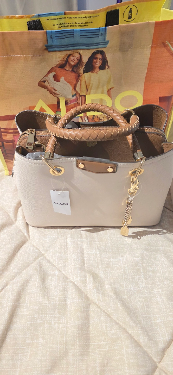 Selling a cute ALDO handbag in beige! It features a braided handle and a gold chain detail. Perfect for everyday use!