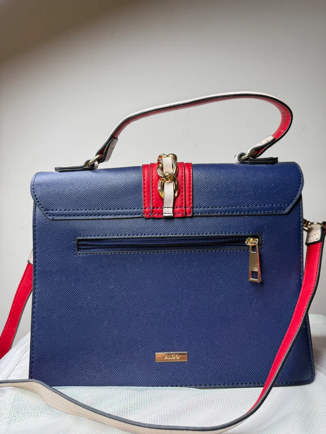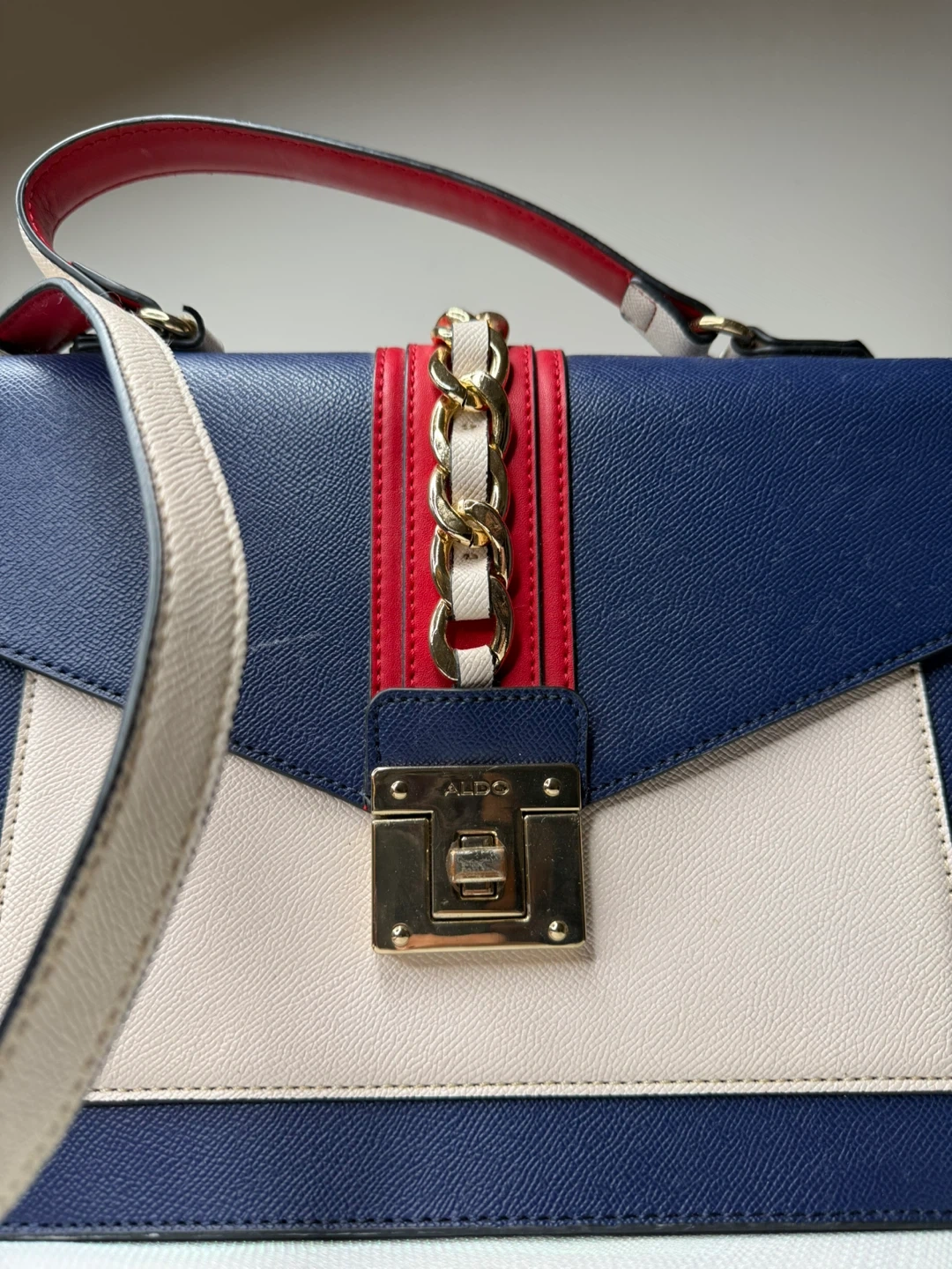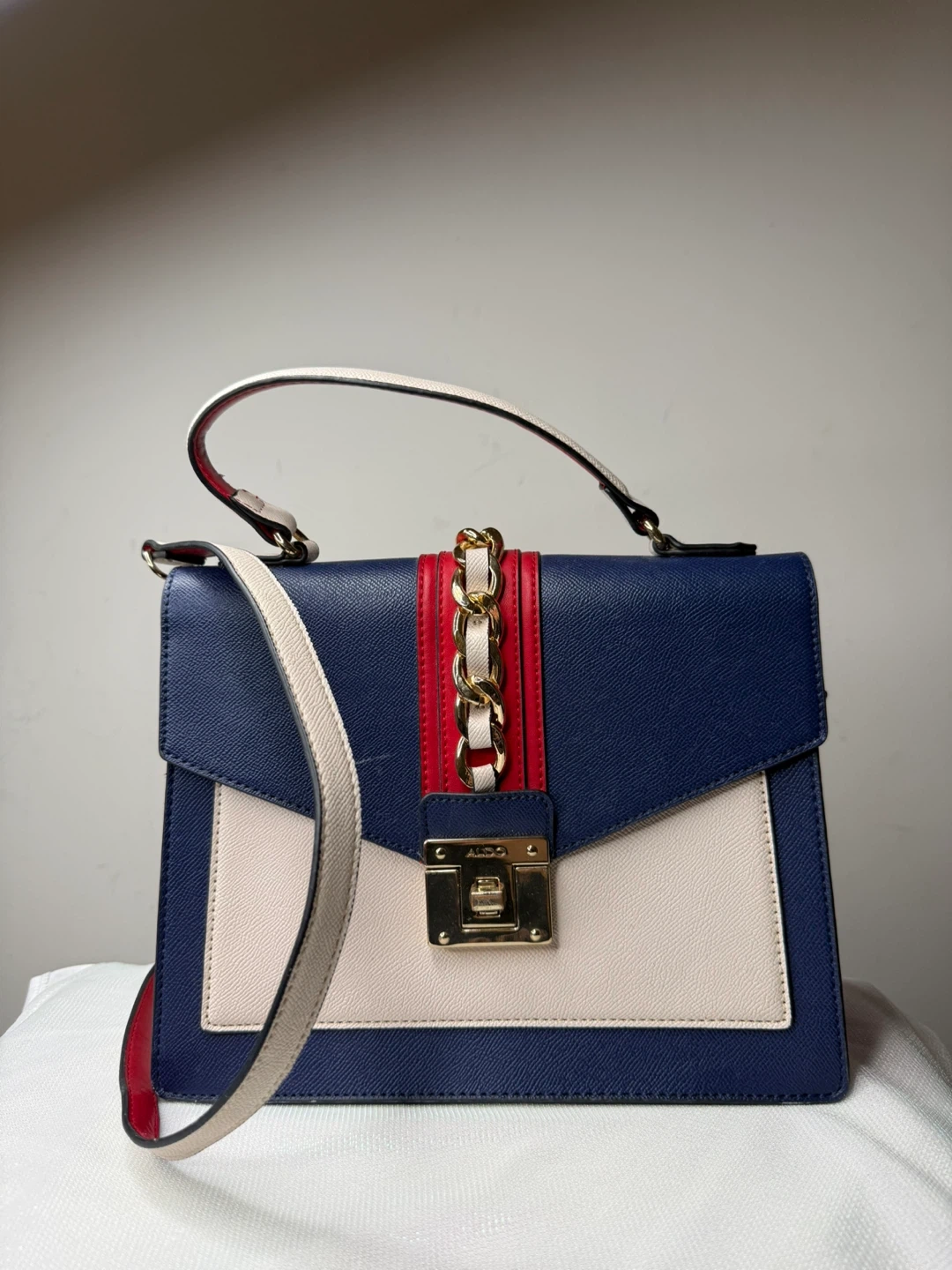 12Stylish ALDO handbag in excellent condition! Features a lovely colour block design with blue, red, and white accents. Perfect for adding a pop of colour to any outfit!