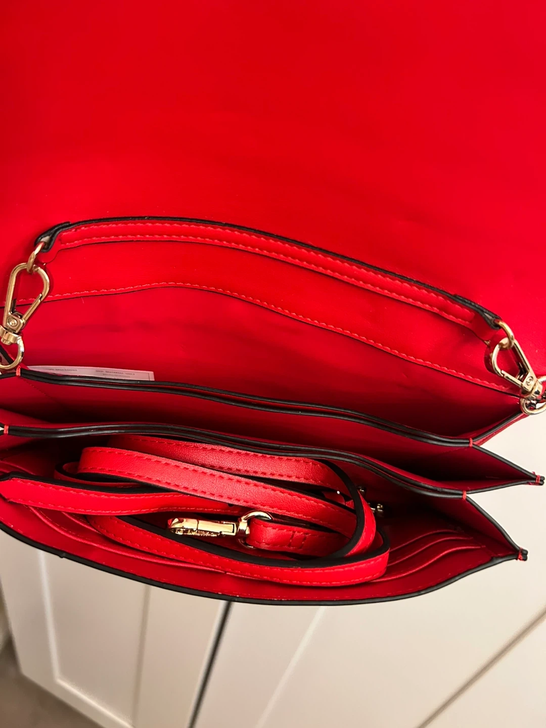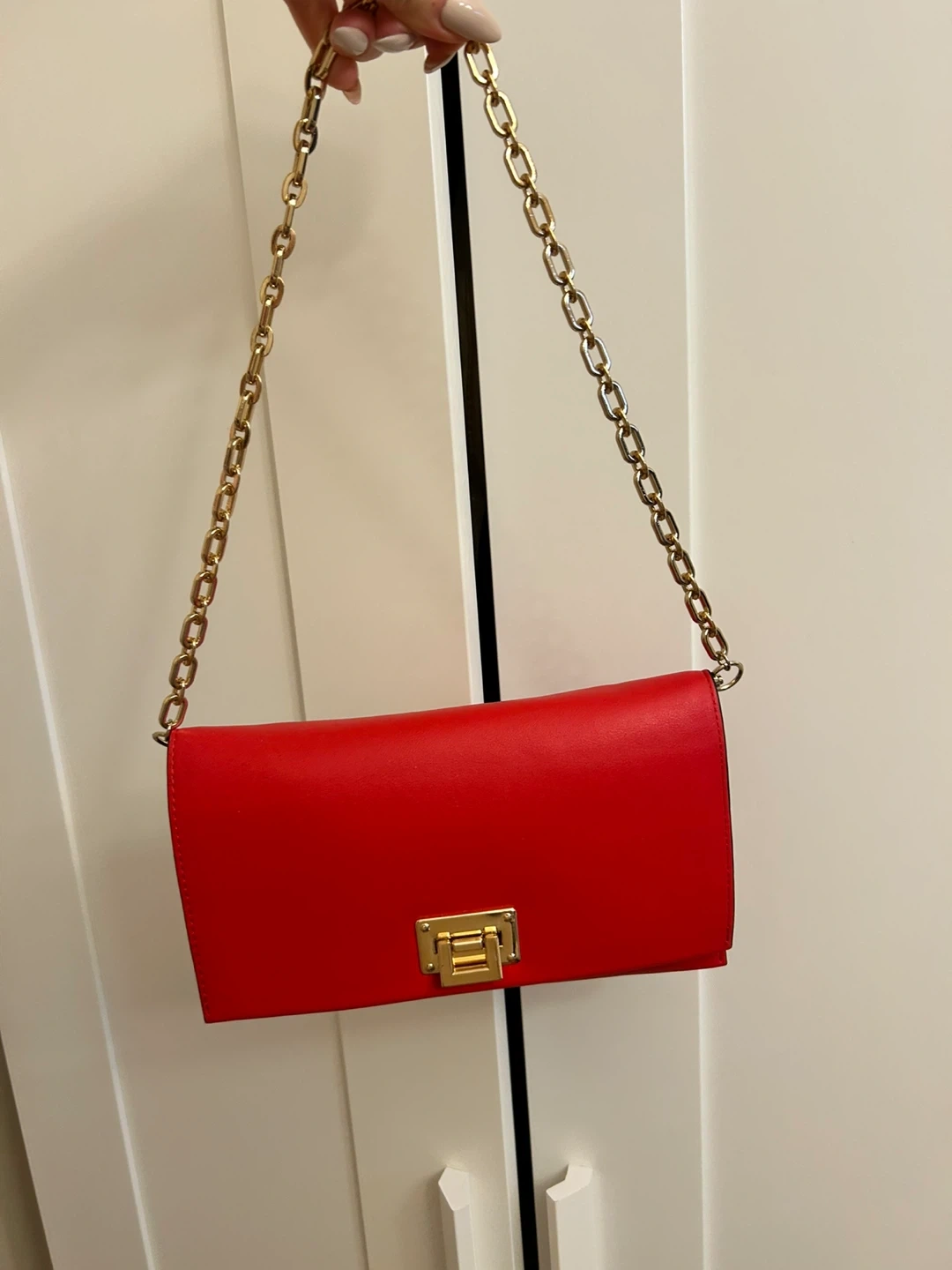 Selling a stylish Aldo red clutch with a gold chain strap! It's in great condition and perfect for a night out or special occasion. The interior has multiple compartments to keep your essentials organized.