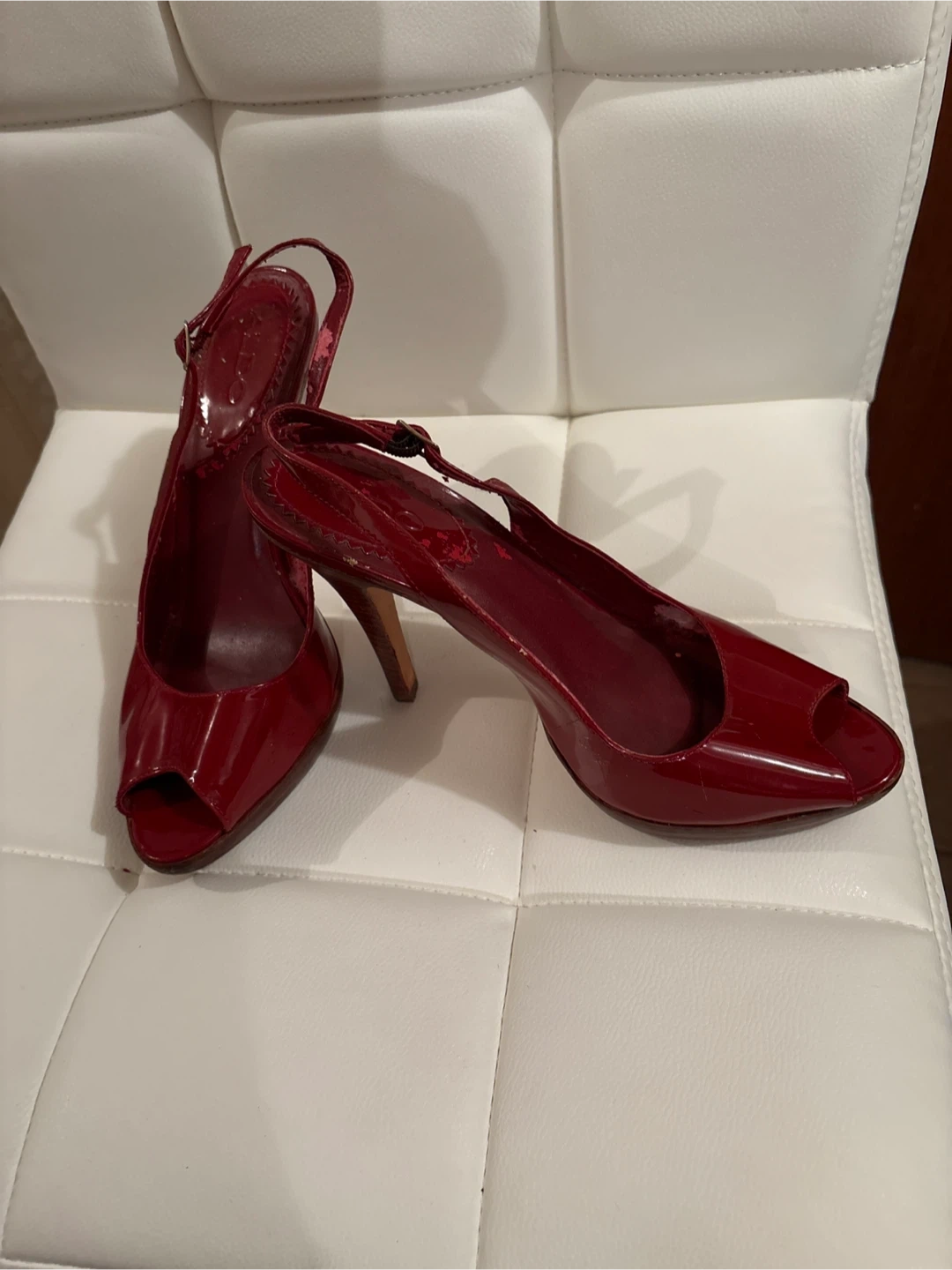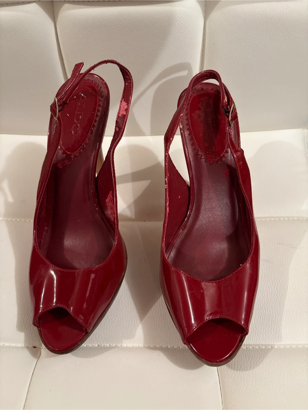 26Selling a pair of Aldo heels in a lovely red patent leather. They are a size 9. They have been worn, as you can see from the soles. Also see details of wear and tear.