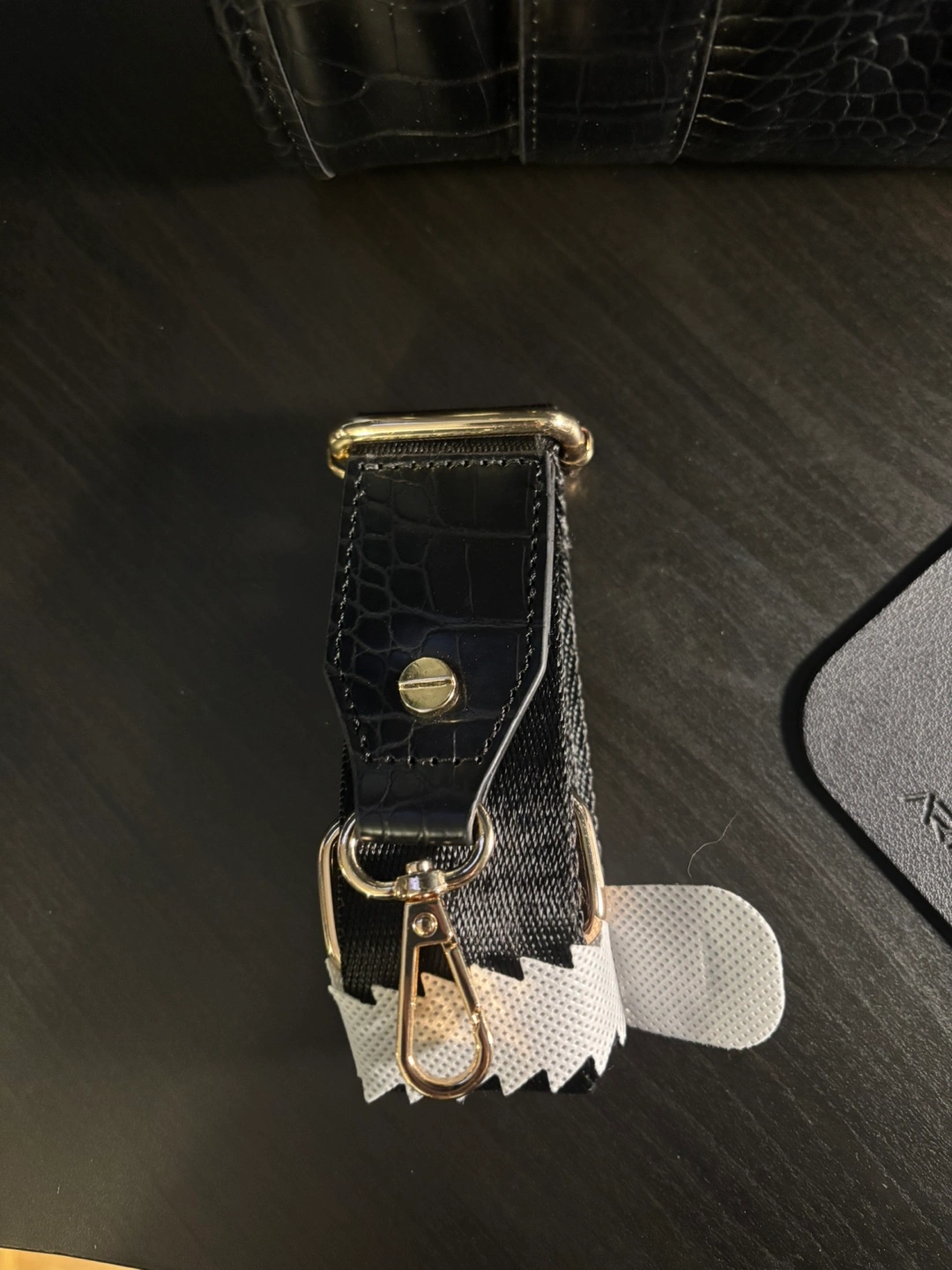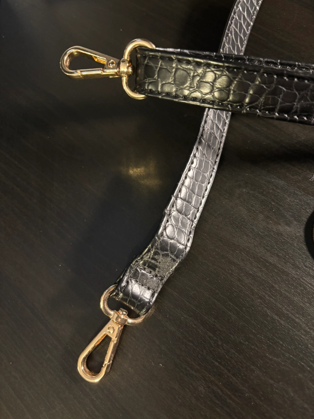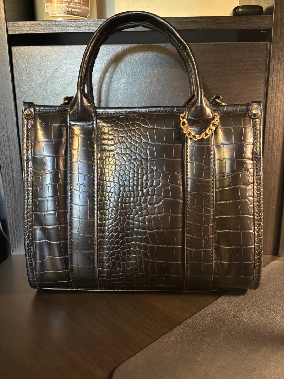 Selling a black Aldo tote bag with a faux crocodile skin pattern. It has gold hardware and two detachable shoulder strap options. Brand new, never used.