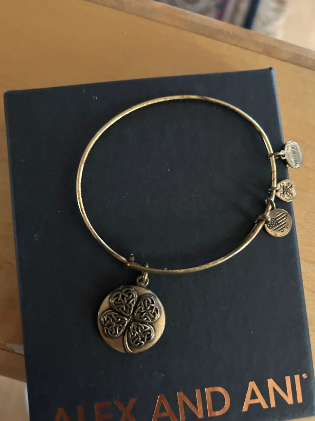 26Selling a gently used Alex and Ani bracelet with a four-leaf clover charm. It comes with its original box, perfect for gifting or keeping it safe. This bracelet features a charm with the inscription 'Blessing, Your Leaf Clover, Alex and Ani, Fortune, Prosperity'.