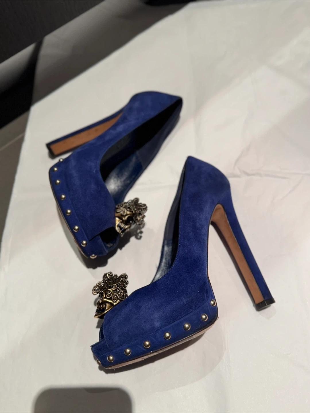 Selling a pair of Alexander McQueen heels in a vibrant blue suede! They are size 37 and feature a unique skull detail. Perfect for adding a touch of edgy elegance to any outfit