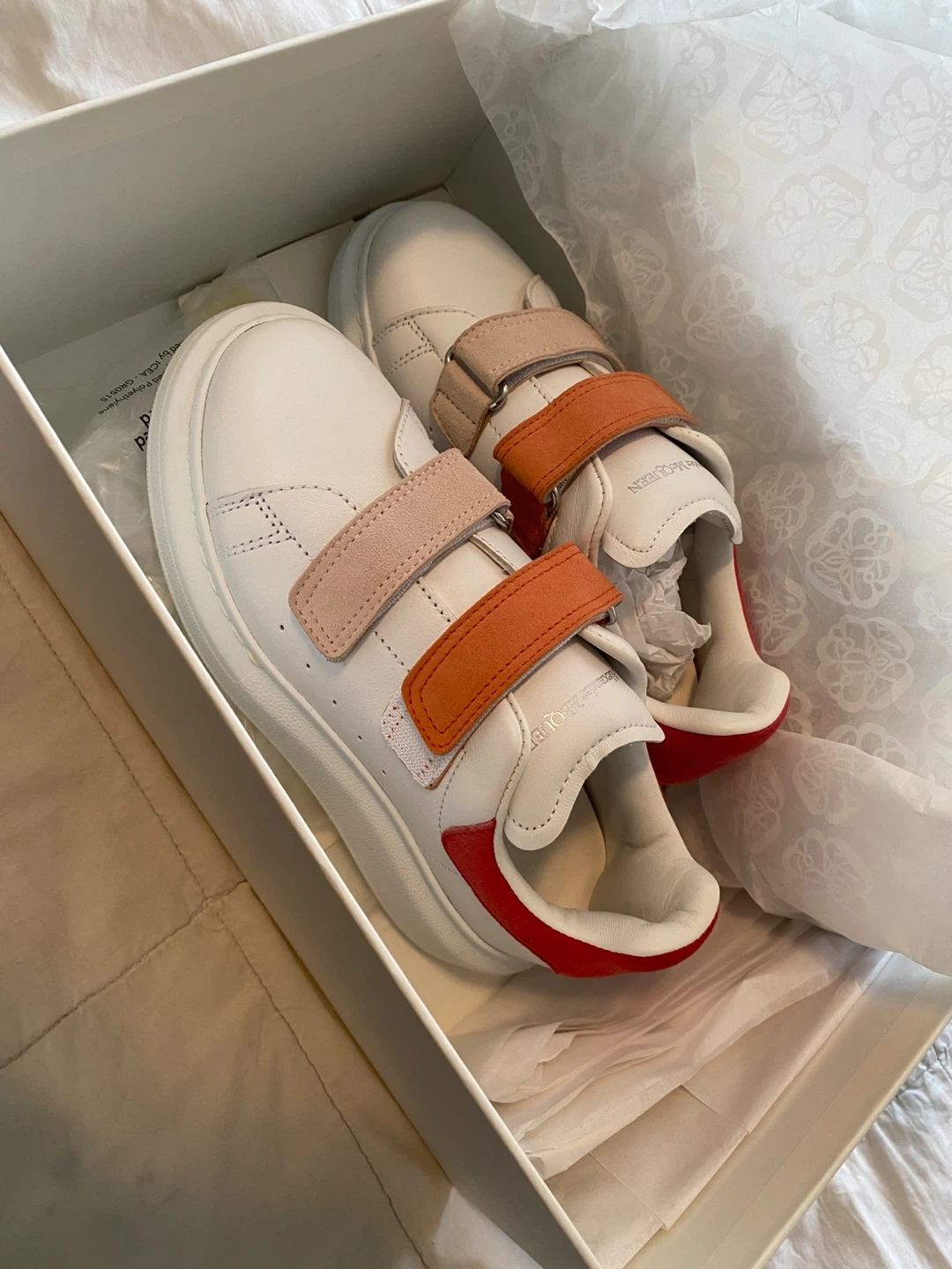 65Selling a pair of Alexander McQueen kids sneakers. They're in great condition and come with the original box! The shoes are white with pink and orange velcro straps, and a red accent on the back. Size is 26.