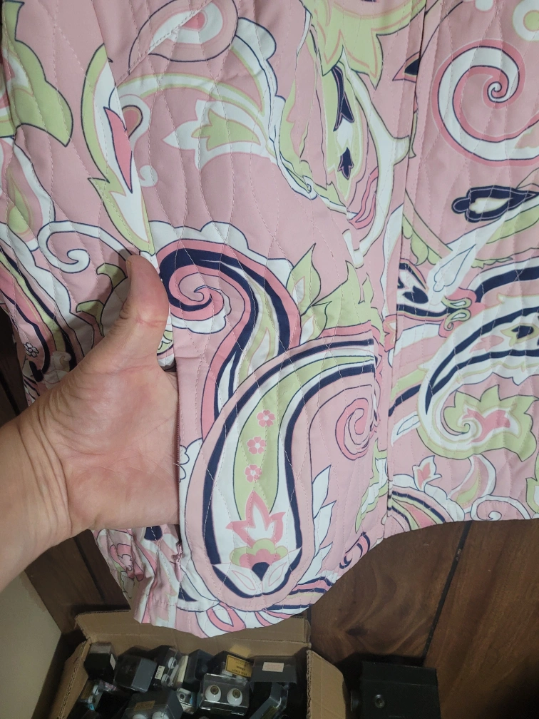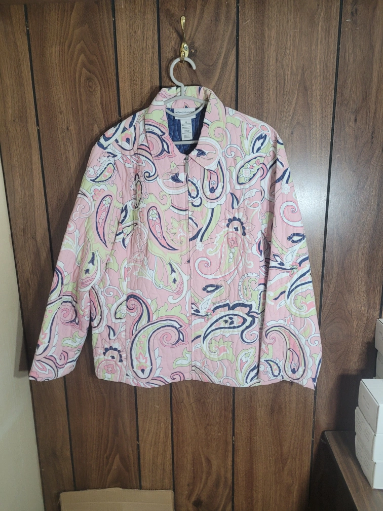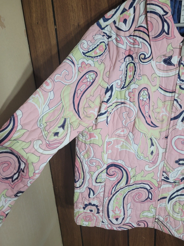 Here's a lovely Alfred Dunner quilted jacket in size 14! It features a unique paisley pattern in shades of pink, green, and navy. The jacket is fully lined with a quilted design, perfect for adding a touch of style and warmth to your wardrobe