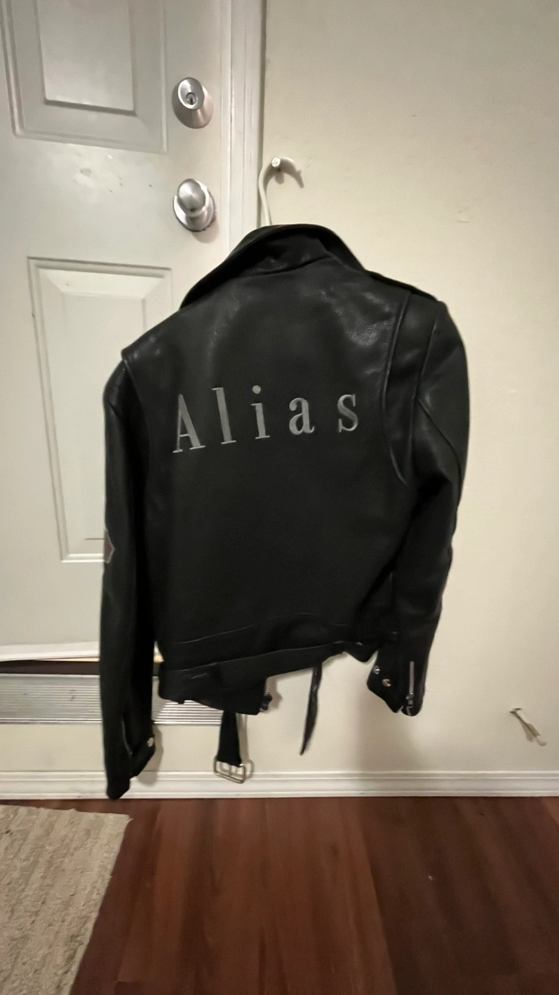62Small size black leather moto jacket. Asymmetrical zipper closure. Features belt detail at waist. Pockets at waist. Small logo patch on sleeve. 'Alias' label on back.
