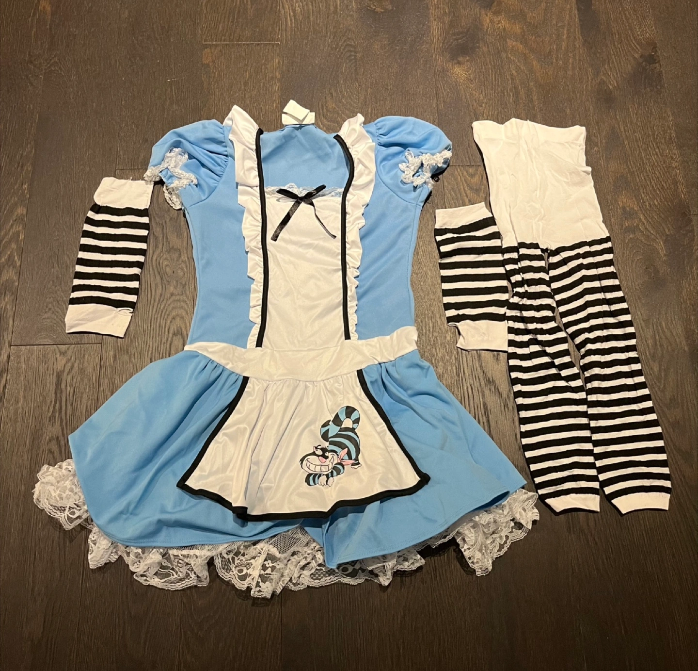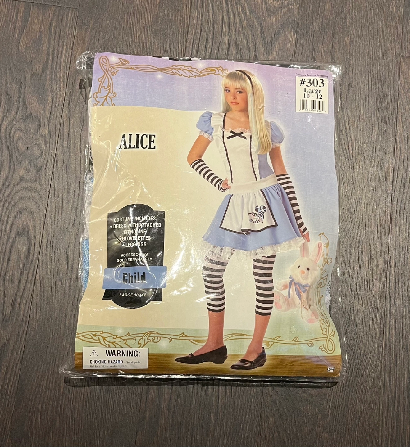 61Selling an Alice in Wonderland themed child's costume, size Large (10-12). The costume includes the dress with attached apron, glovettes, and leggings. It's a super cute costume!