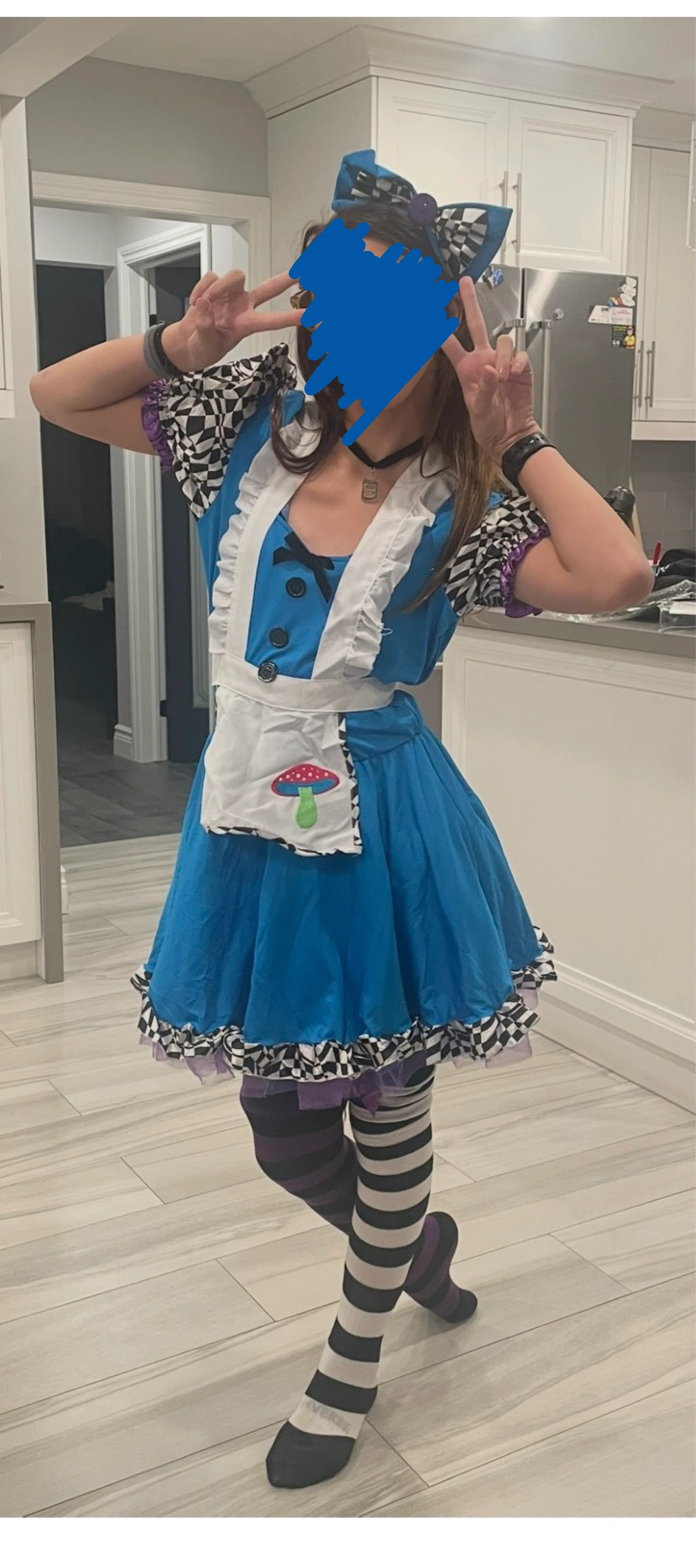 10Selling an Alice in Wonderland costume! It includes the dress, apron, socks and headband. The dress is blue with a white apron that has a mushroom on it. The headband is blue and black checkered. The costume also comes with striped stockings