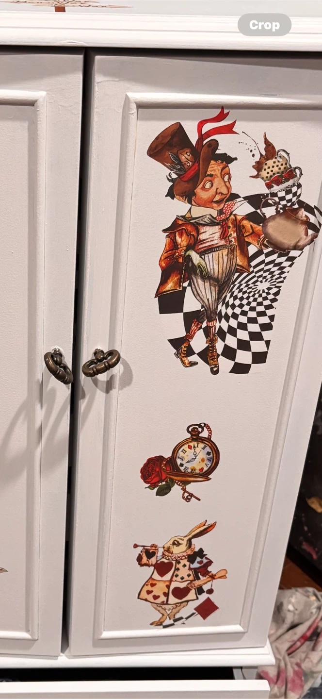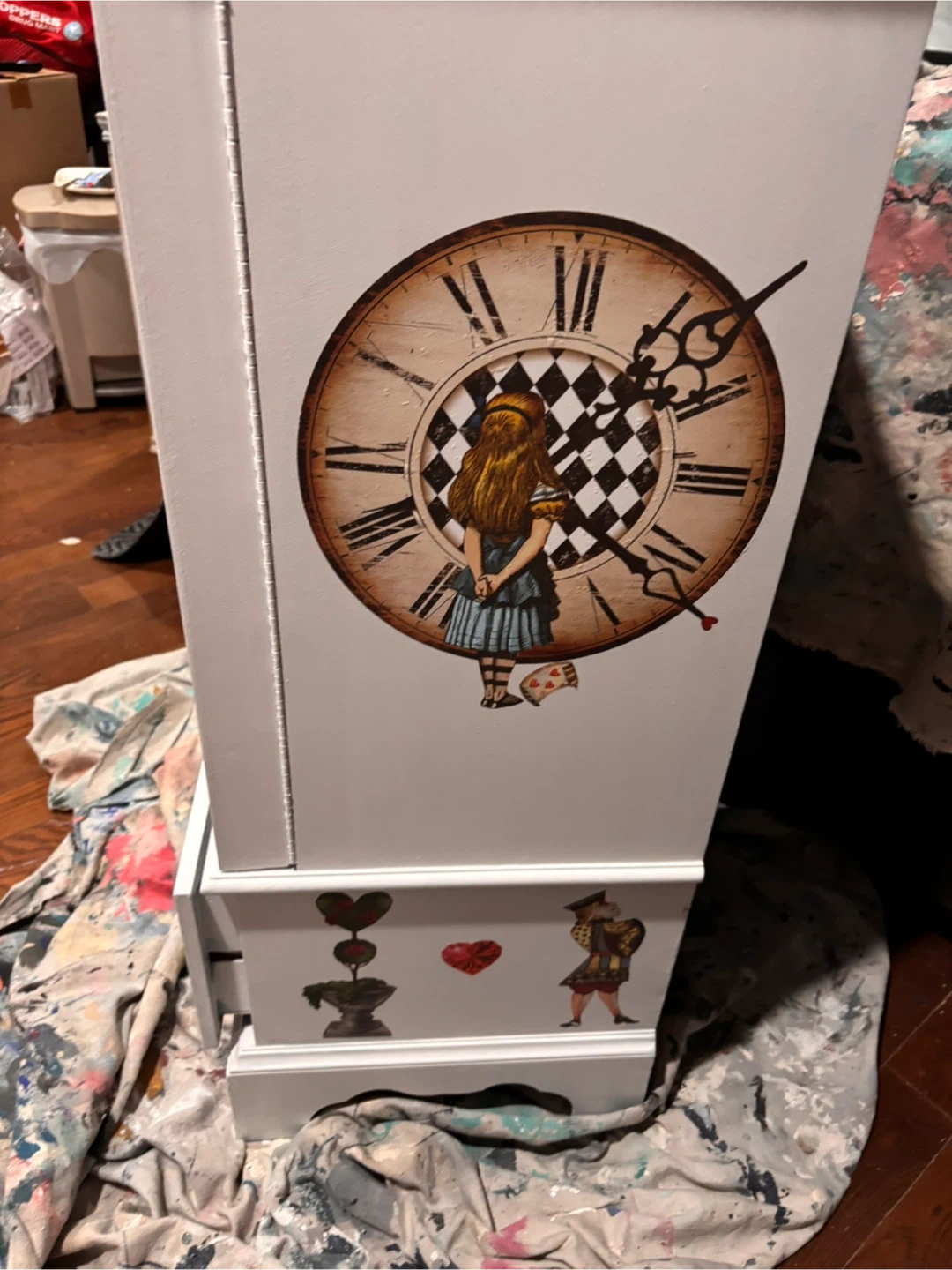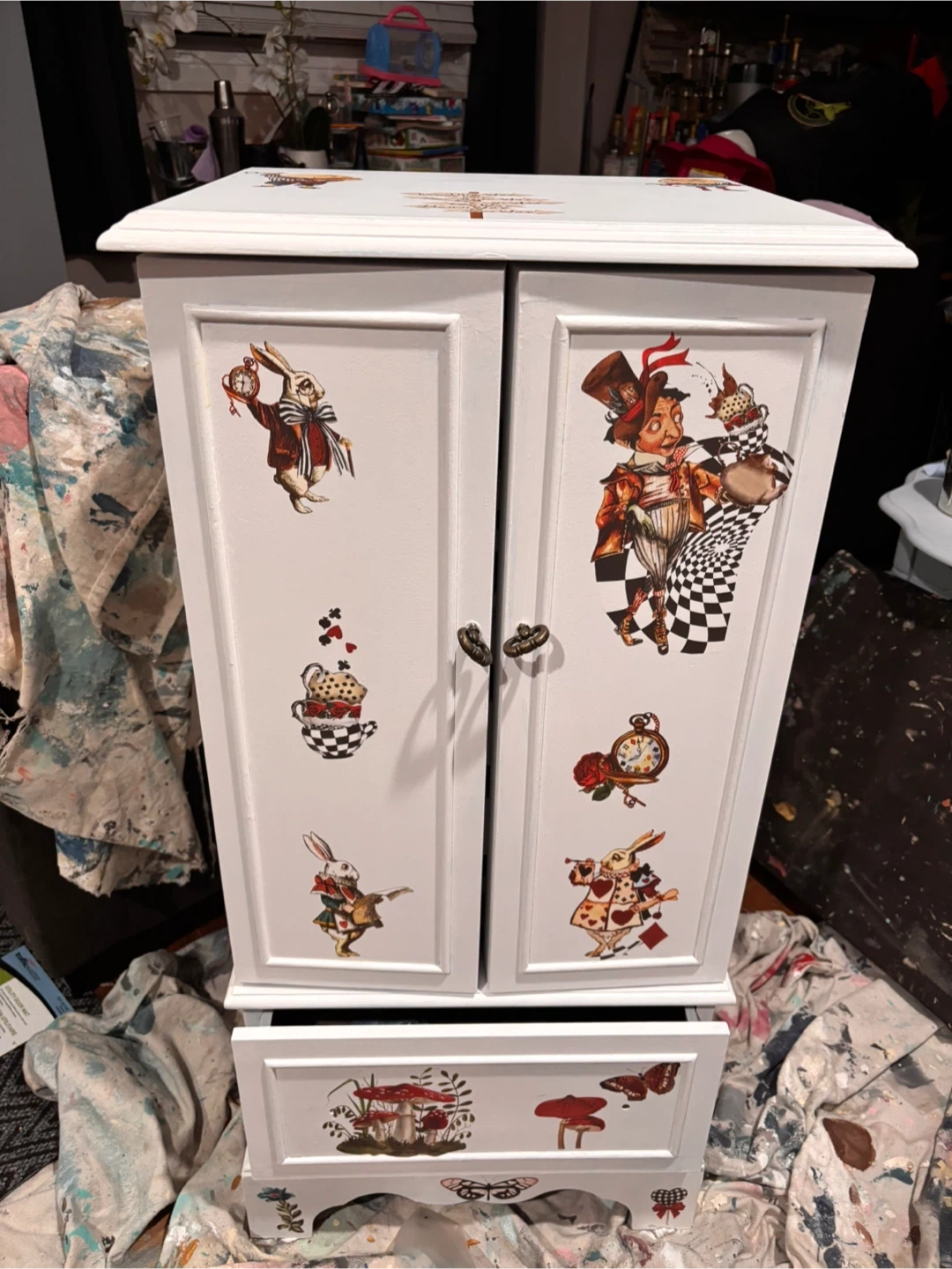 74This unique jewelry box is hand-painted white with Alice in Wonderland themed designs. It features multiple drawers and is perfect for storing jewelry or other small items. The whimsical artwork adds a playful touch to any room!