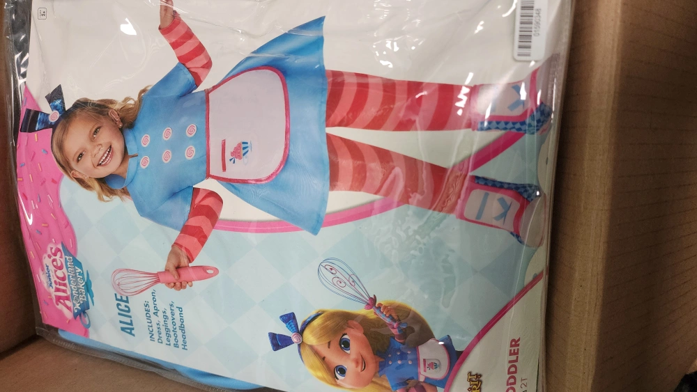 Selling a brand new Alice's Wonderland Bakery costume from Spirit Halloween in toddler size 2T! The costume includes the dress, leggings, apron, and headband, all in the original packaging. Perfect for Halloween or dress-up play!