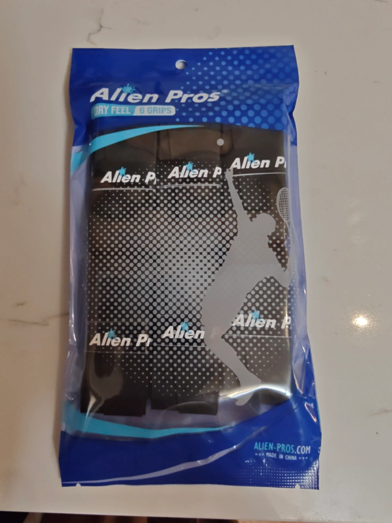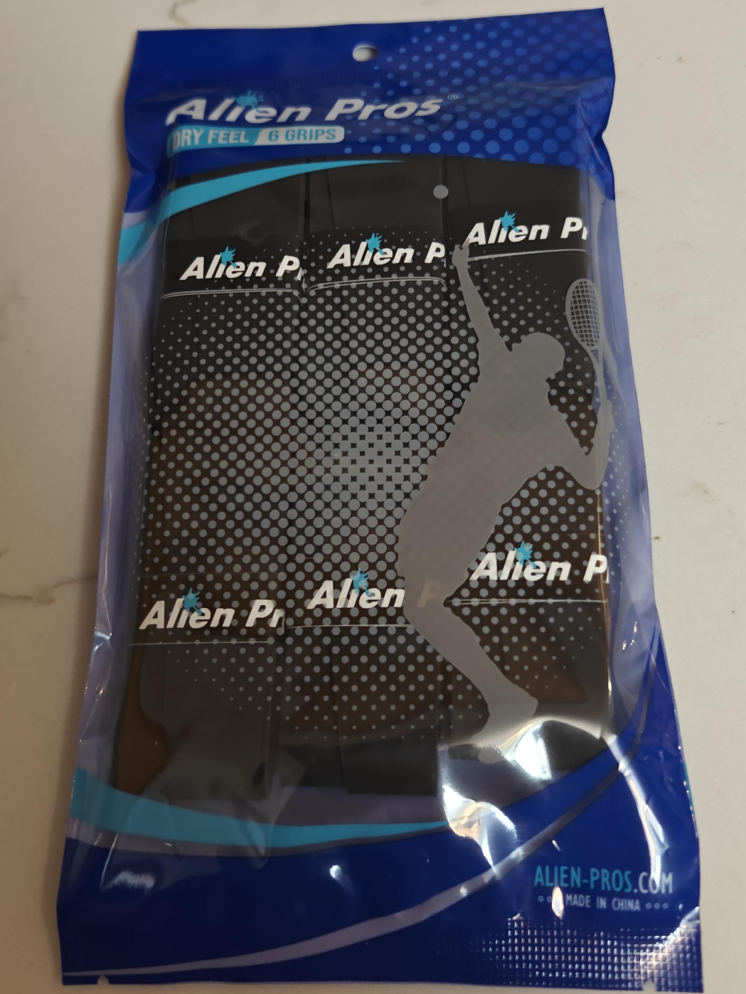 Brand new package of Alien Pros tennis overgrips! These are the dry feel grips, and there are 6 in the package. They're great for keeping your racquet handle dry and comfortable during play. Perfect for tennis enthusiasts!