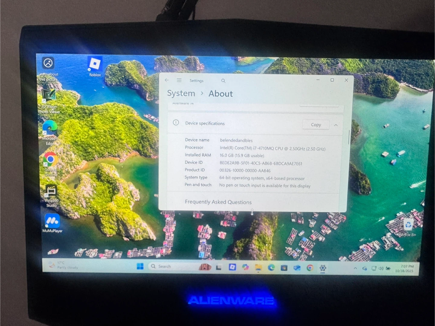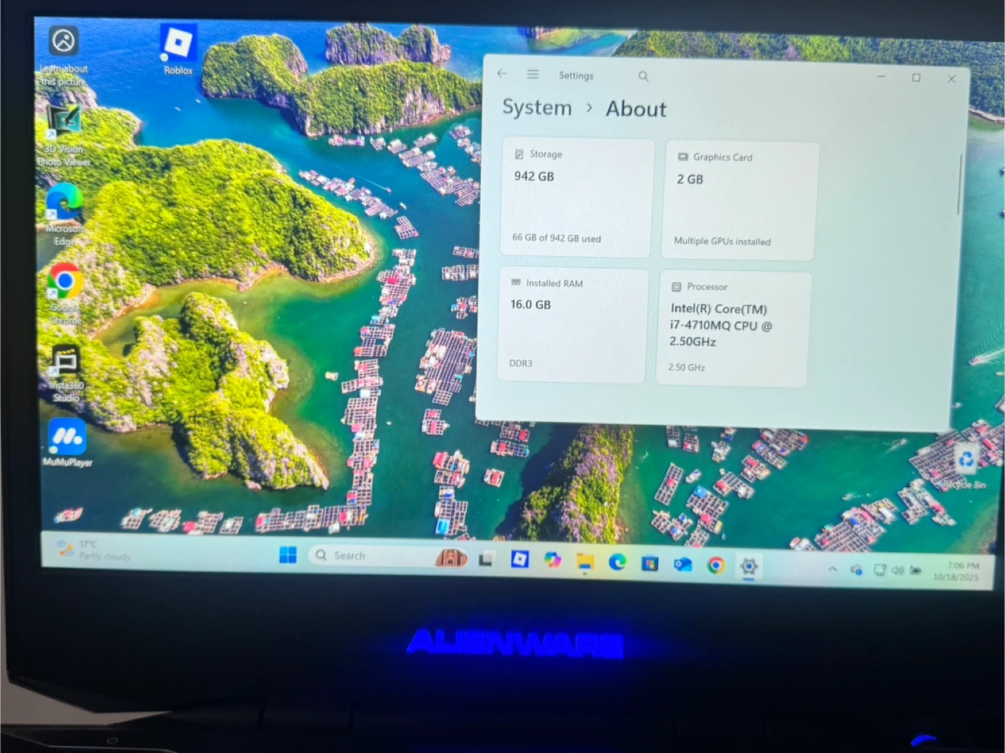 0Selling my Alienware gaming laptop! Specs: - Processor: Intel(R) Core(TM) i7-4710MQ CPU @ 2.50GHz (2.50 GHz) - Installed RAM: 16.0 GB (15.9 GB usable) - Storage: 942 GB - Graphics Card: 2 GB Battery is dead. Need to be plugged in during use. I got this frim someone and used it for a couple of months for work(video edits) only while my pc is on repair shop. Still running ok as a desktop pc.