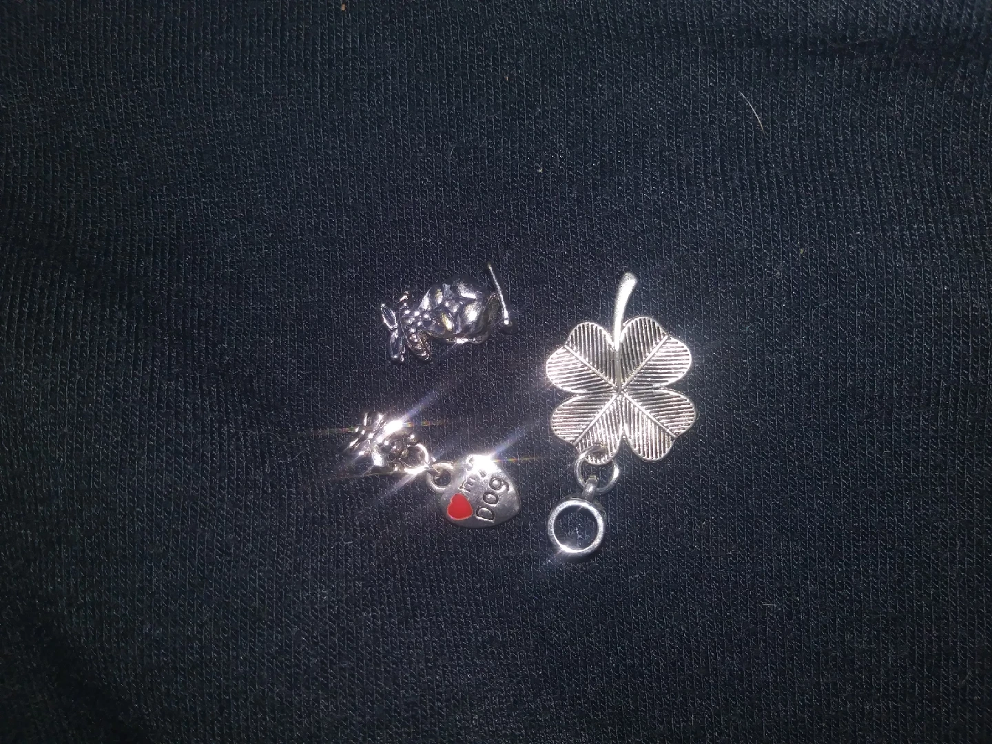 26Selling a cute set of silver charms! Includes a four-leaf clover charm and a dog-themed charm. Perfect for adding a little sparkle to your bracelet or necklace