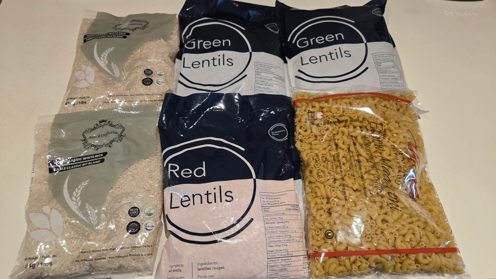 All brands new White Rice long grain x 2 Green Lentils x 2 Red Lentils x 1 Macaroni Pasta x 1 expire, March 2027